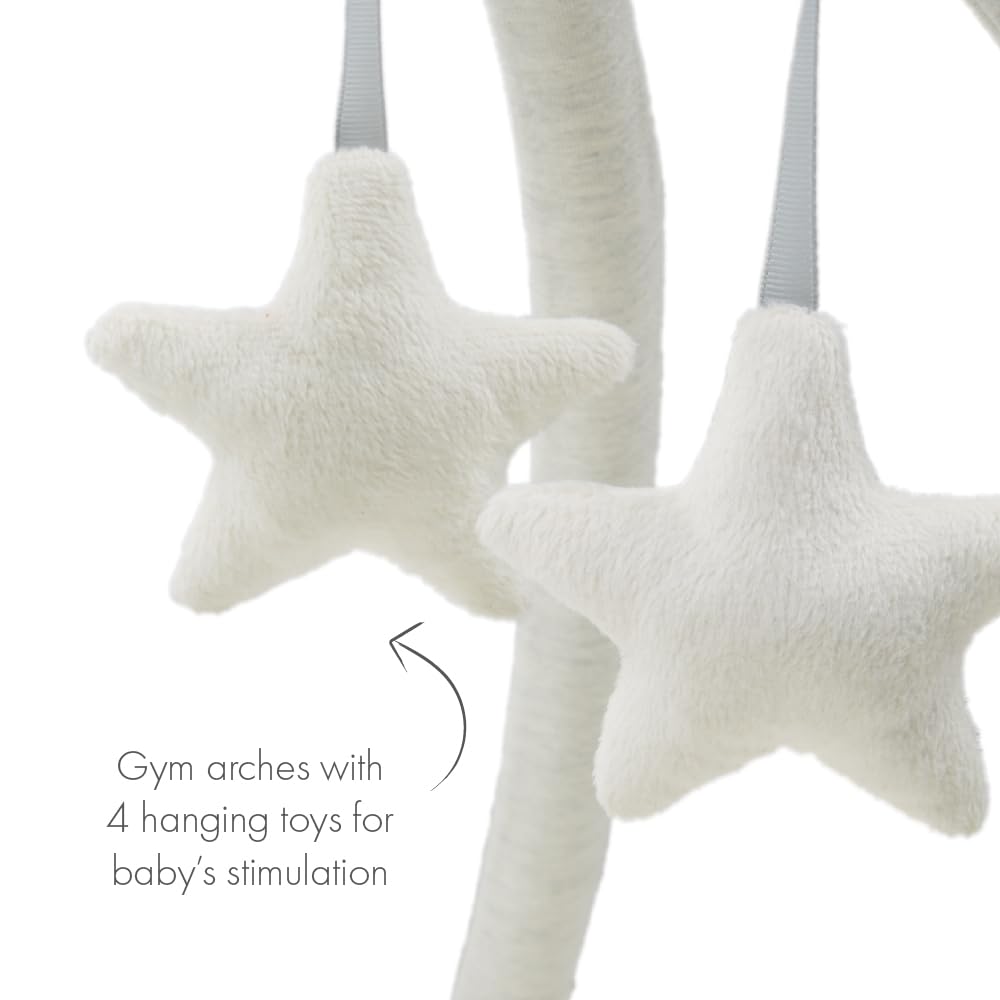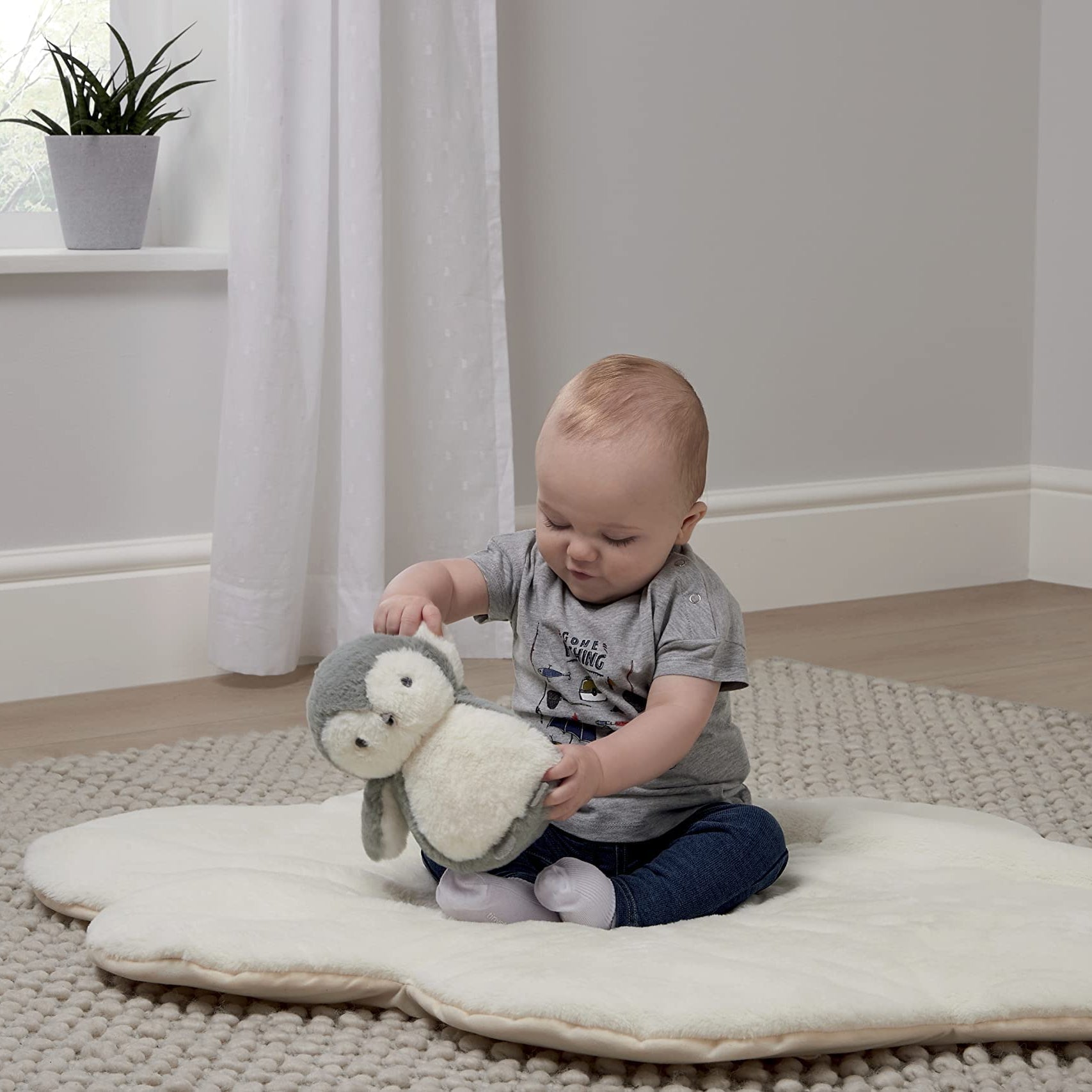 Celebrate your baby’s first moments with the Wish Upon A Cloud Play Mat & Gym. Made from plush, super-soft fabrics in gentle creams and grey, this luxurious mat creates a safe, comfortable space for baby to explore and play. The detachable gym arches feature four engaging hanging toys, each with hidden crinkle, squeaker, or rattle sounds to encourage reaching and grabbing. With a hanging moon, penguin toy, and a light-up penguin friend, baby will enjoy sensory-rich playtime from birth. Perfect for nurturing development while making every play session fun and inspiring.
