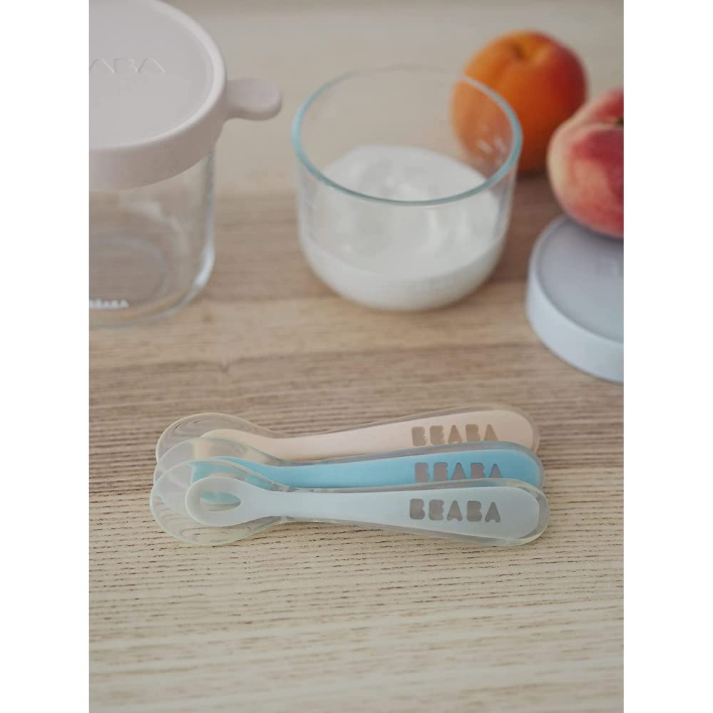 Béaba Ergonomic spoon for learning in the first months. The soft silicone tips are specifically designed for teat/spoon passage. Handle length suitable for all types of jars.