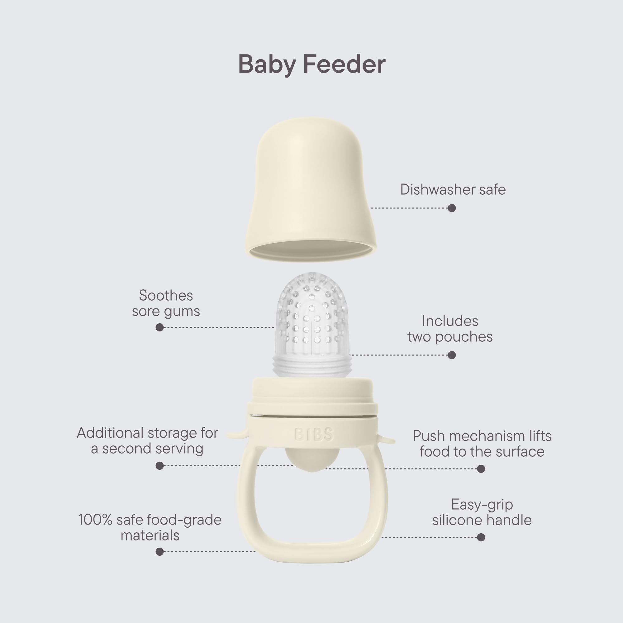 The BIBS Baby Feeder is the perfect companion for your baby’s first bites—making mealtime more enjoyable, safe, and stress-free. The soft, flexible silicone nipple features tiny openings that act like a strainer, allowing liquids and little nibbles to flow through slowly. Fill it with frozen breast milk or formula to ease teething discomfort, or with soft fruits and veggies for a safe, tasty introduction to solids. The Baby Feeder includes two silicone nipples and is compatible with cubes from the BIBS freezer tray.