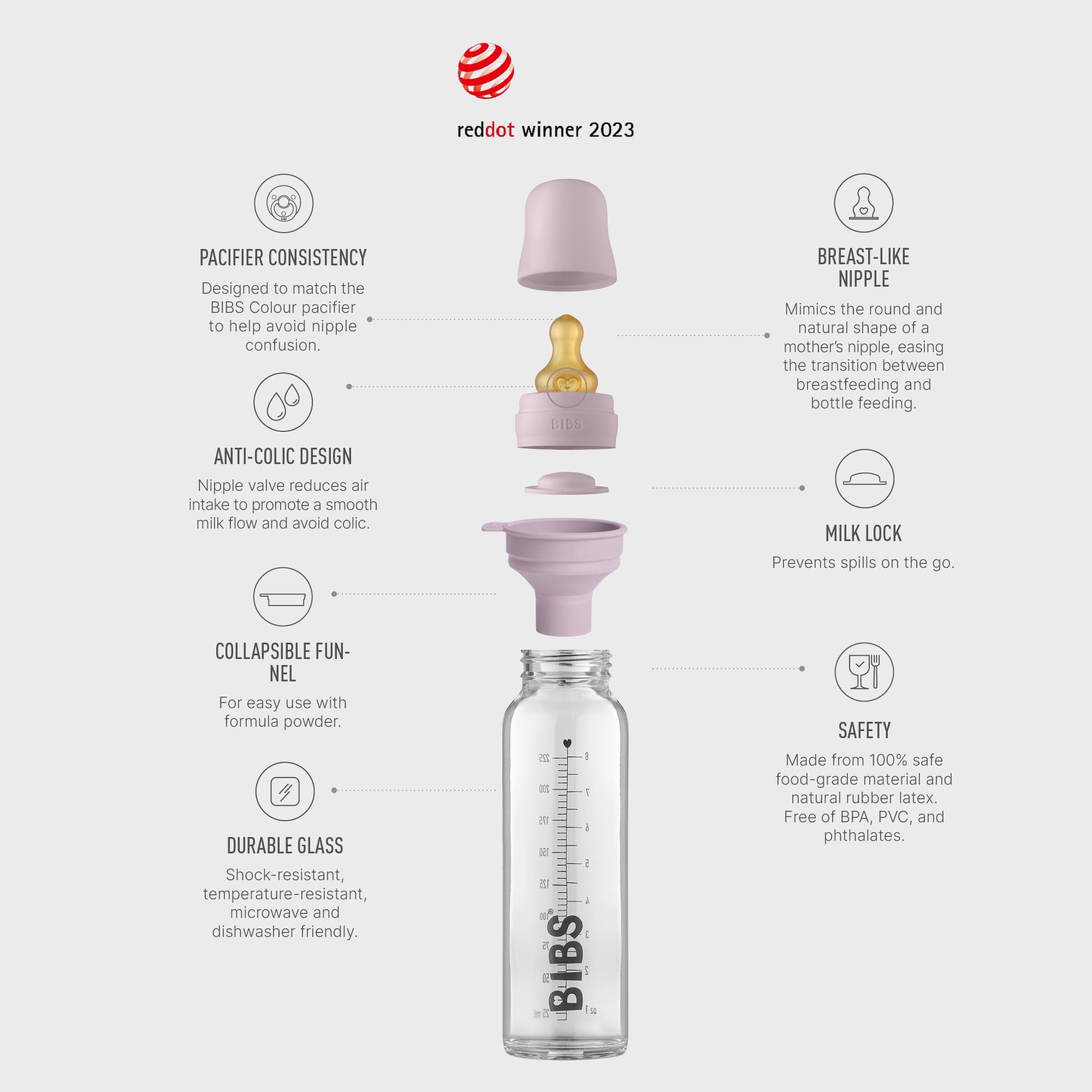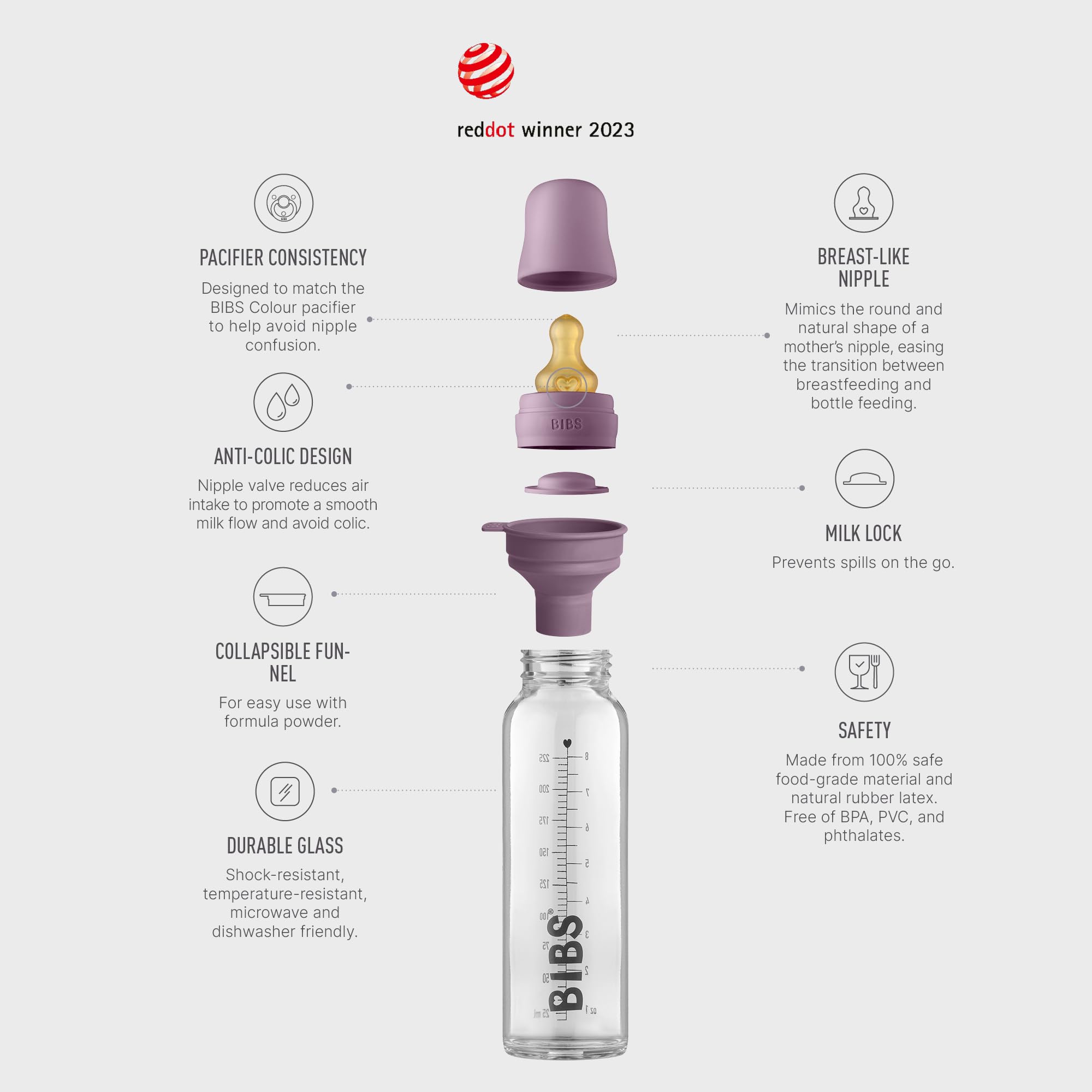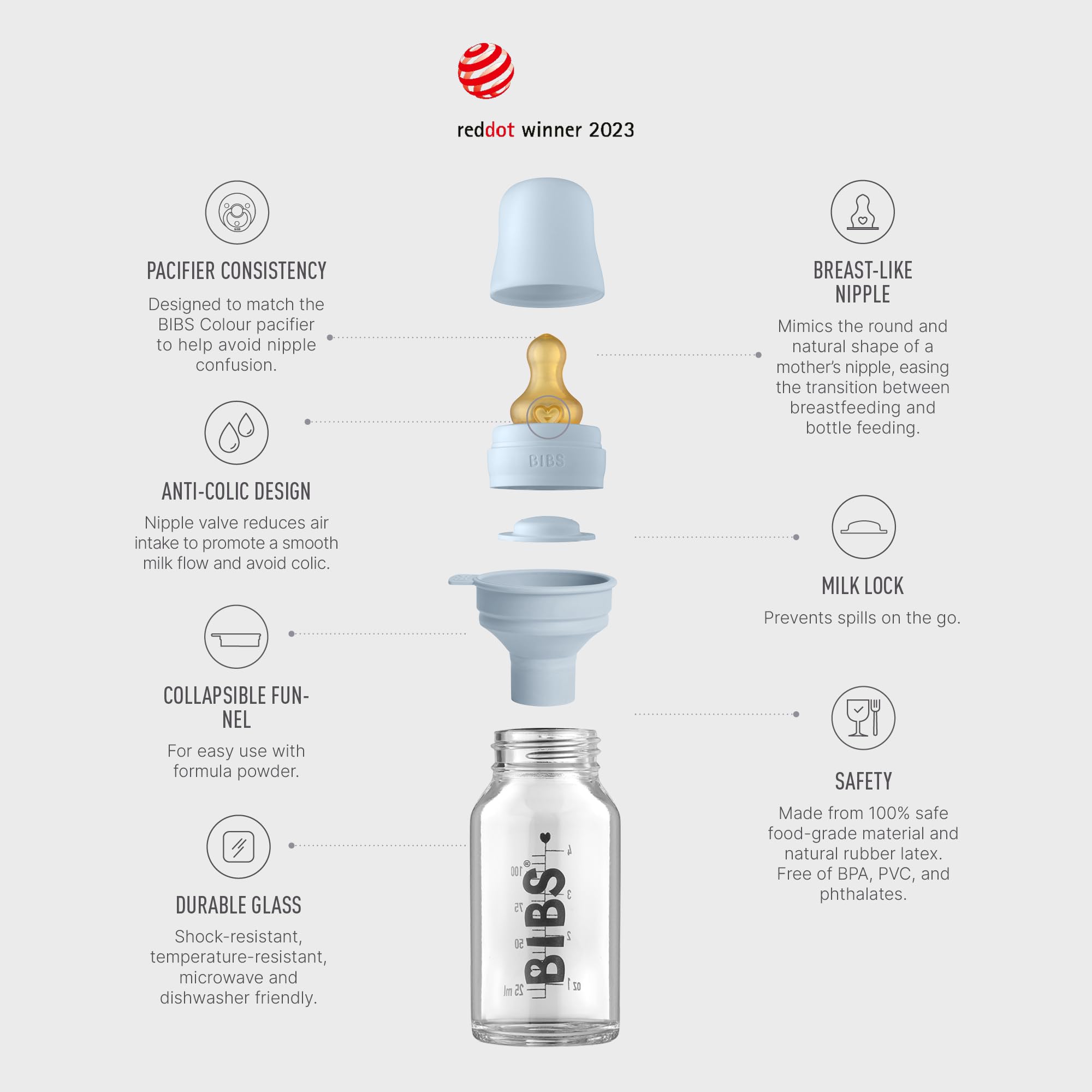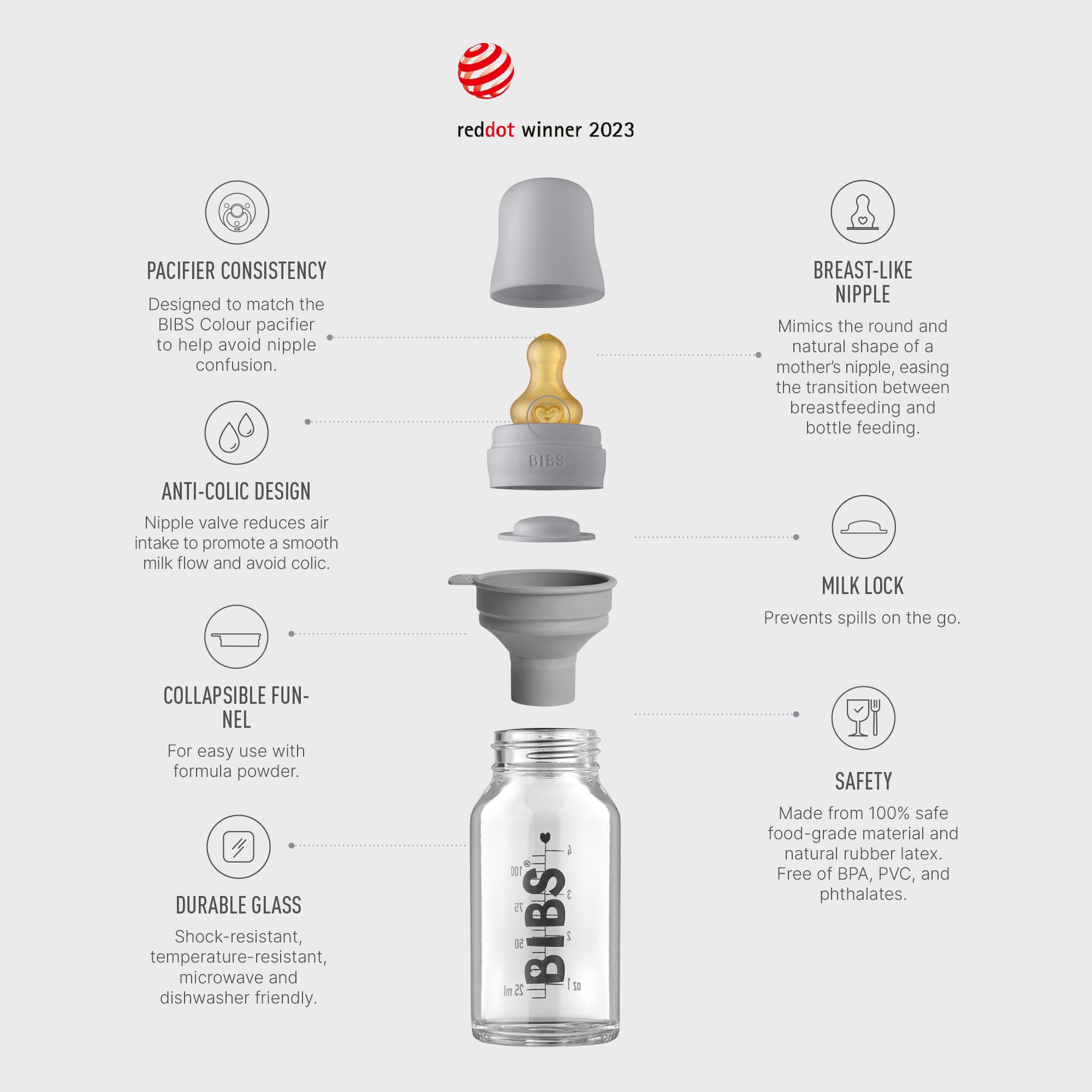 The BIBS Baby Glass Bottle Complete Set is made of borosilicate glass, which is temperature- and thermal shock-resistant, this durable baby bottle is designed with the needs of your child in mind. From the easy-to-grip ergonomic design to the nipple that simulates the breast, this bottle provides a natural feeding experience for both baby and parent. Complete with a caps and a base, this bottle is perfect for on-the-go parents who want to have everything they need in one convenient place.
