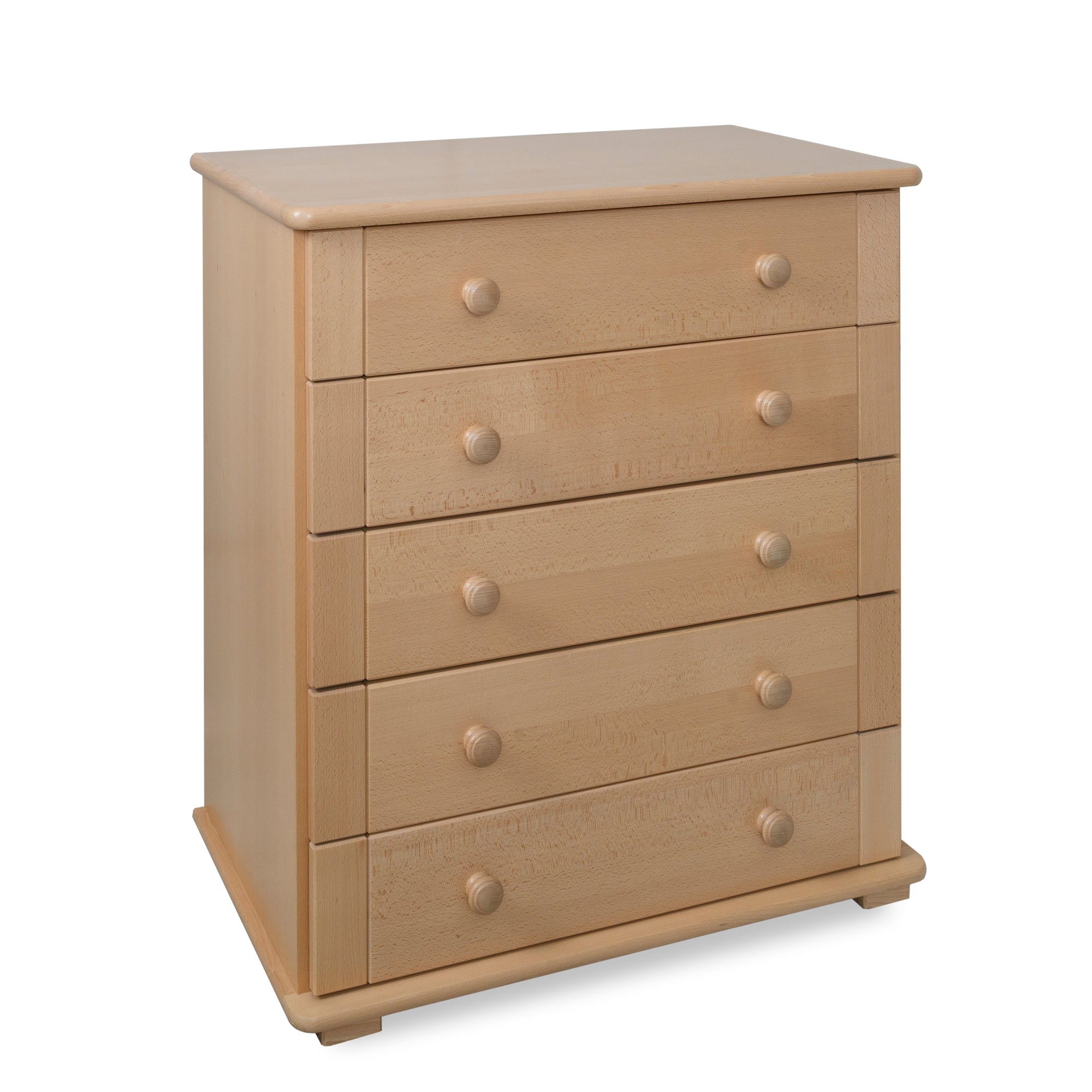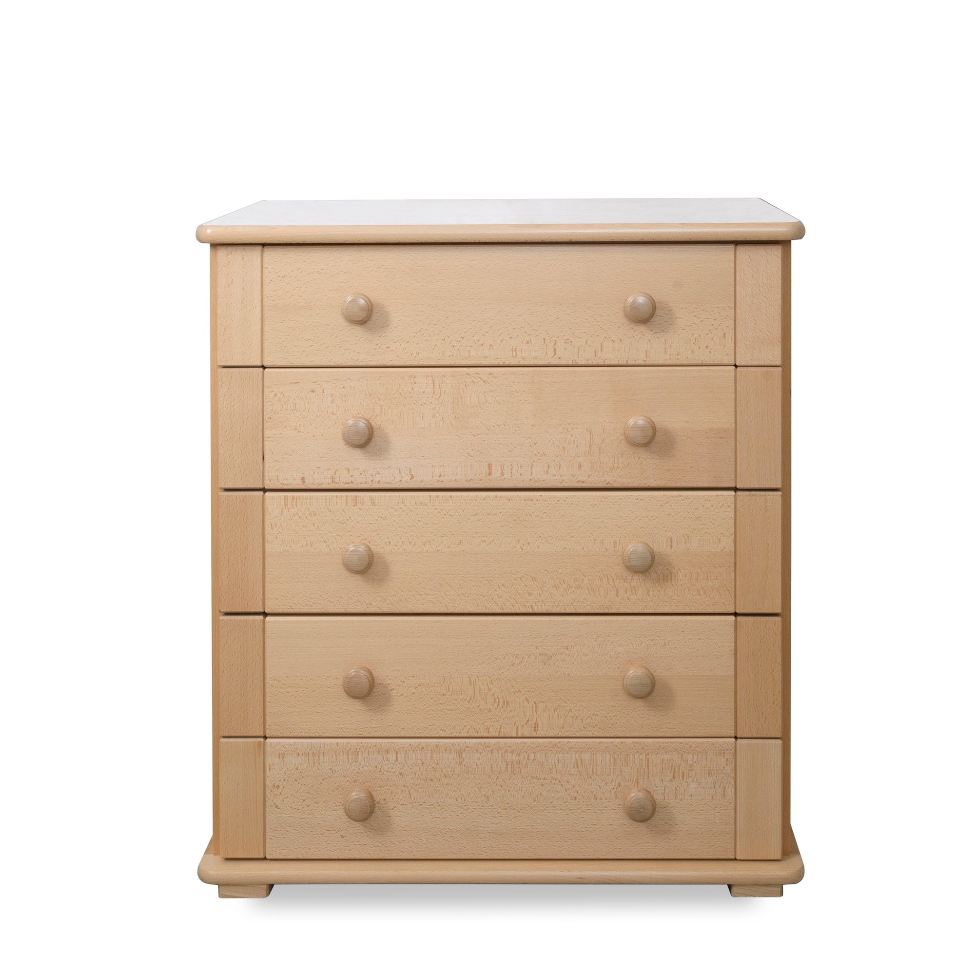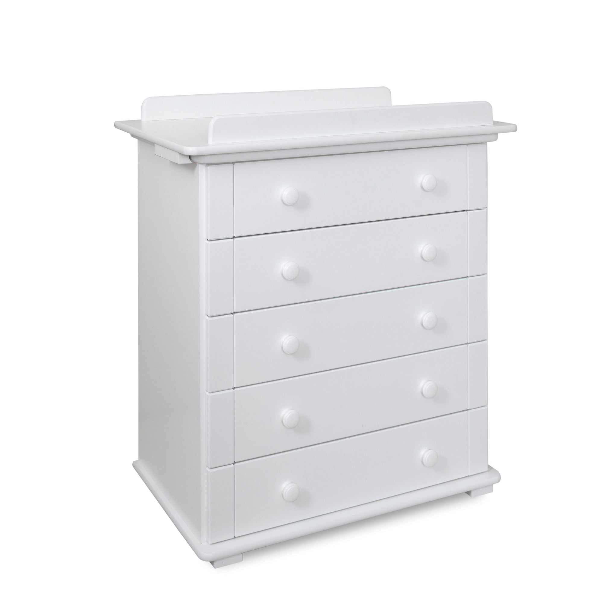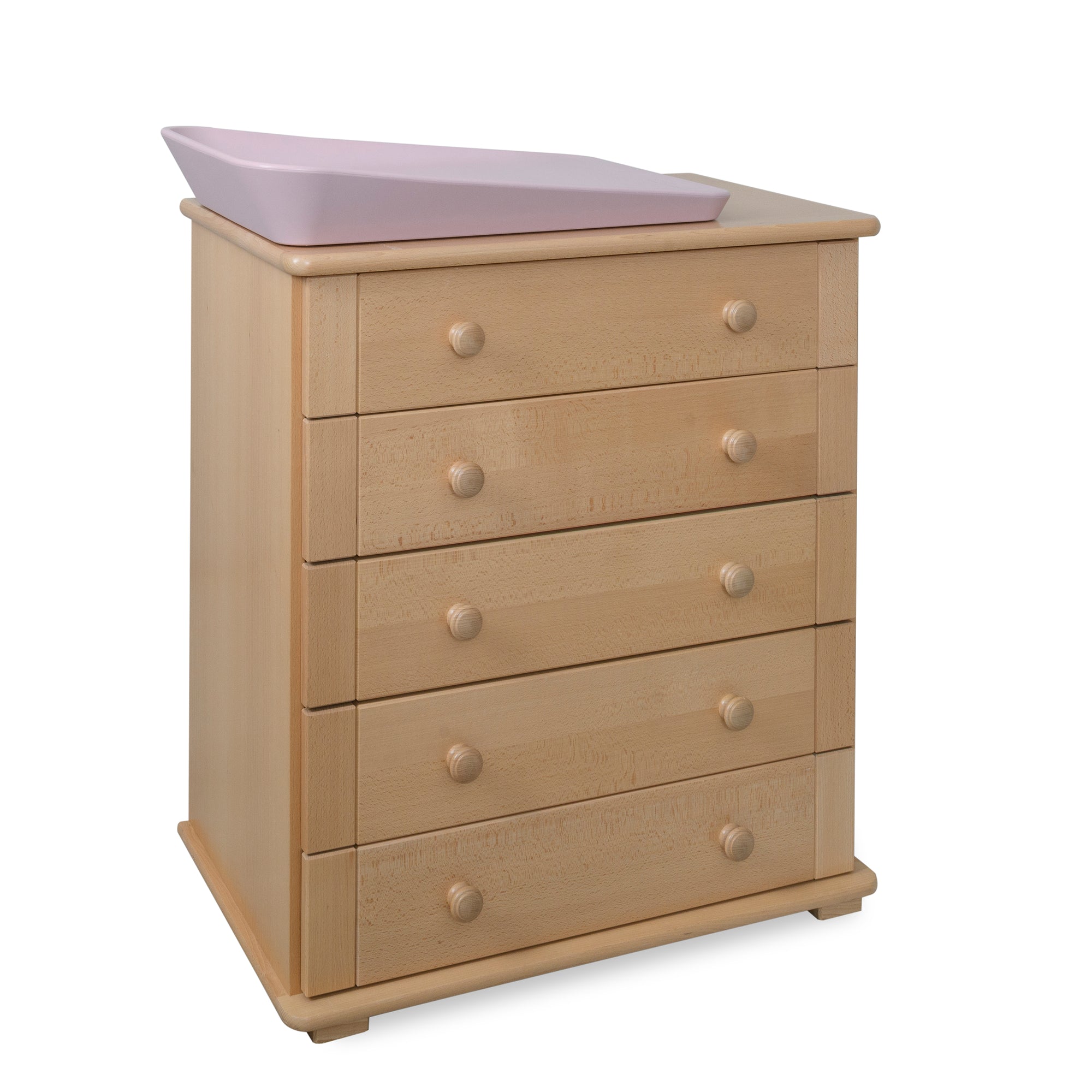 The magic of our 5 drawer chest of drawers is quite simply in its weight (it's 64kg), height and extra drawer space. New parents inadvertently place a lot of strain on their backs by carrying and lifting their baby while doing everyday tasks and we believe parents are worth looking after just as much as our babies. The additional weight (there is an internal 50kg ballast) means it won't ever tip, 5 drawers give it maximum storage space and it is the optimum height to protect parents’ backs by reducing the amount of bending required for those 50 or so weekly nappies!