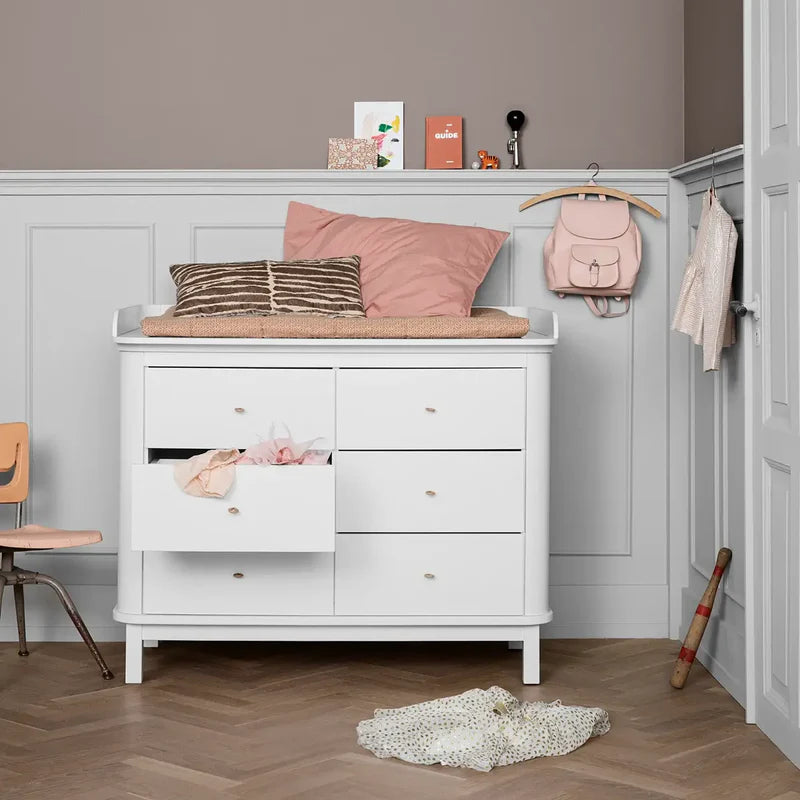 Oliver Furniture Wood 6 Drawer Dresser in White & White/Oak is the perfect option for your modern nursery. The rounded edges at the front and sides give it a soft and light feel. It has six soft closing drawers which have beautiful handmade leather pulls. There are two particularly handy rounded hooks either side of the dresser - so everything can be to hand.