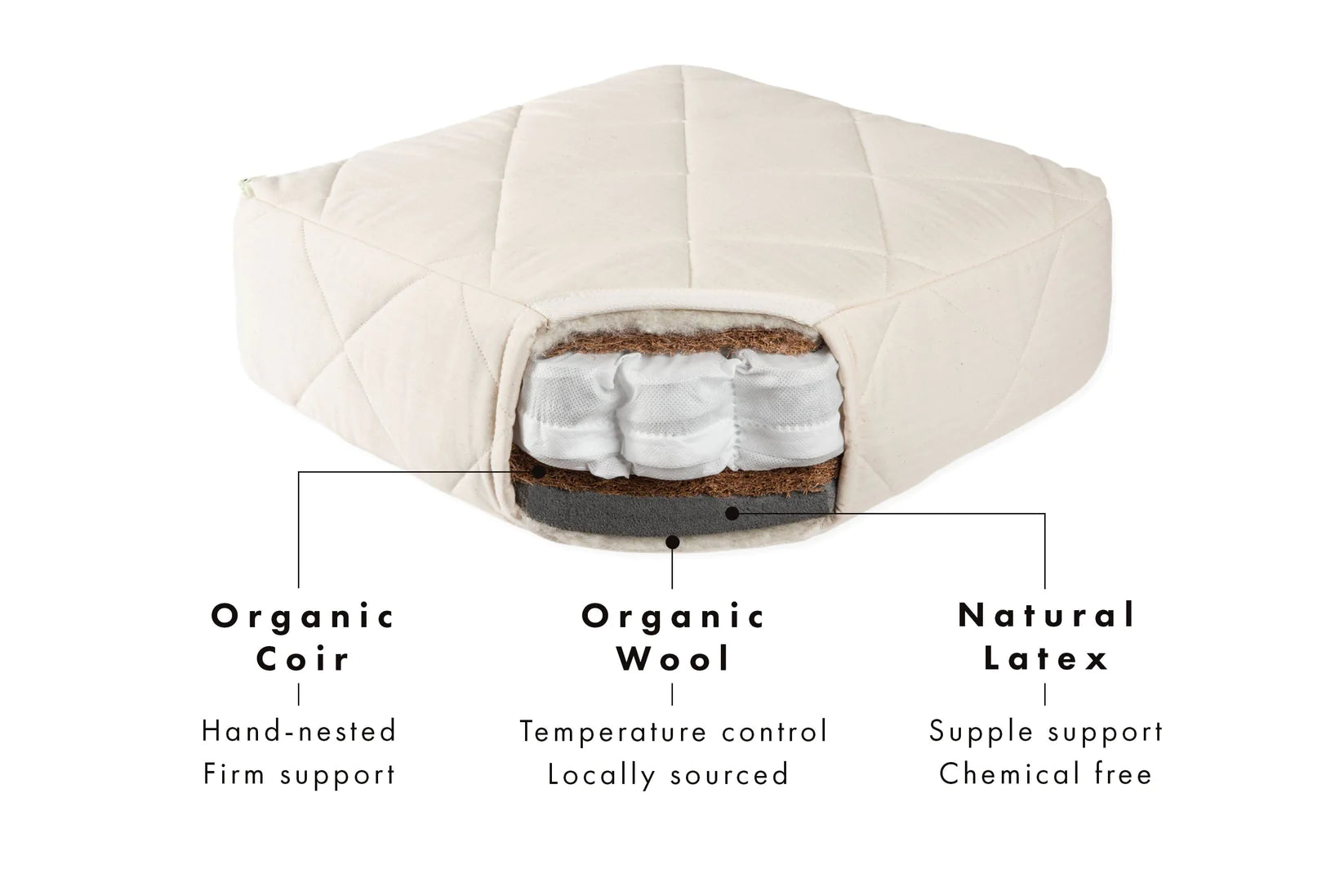 It’s recommended that younger children sleep on something firm and flat (such as our Coco Mat) - however, as they grow, some children prefer a more forgiving mattress. The Spring Mat is designed with these little ones in mind, featuring two independent layers of support that develop with your child as their preferences change.. The Spring Mat is made from everything you’d expect of a Naturalmat Baby mattress, with the addition of miniature pocket springs nested in cotton pockets - delivering all the benefits of natural fibres with the feel of a pocket sprung mattress.