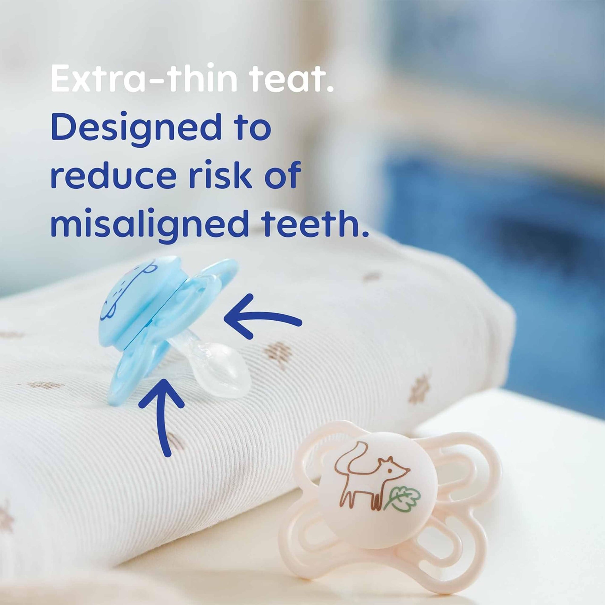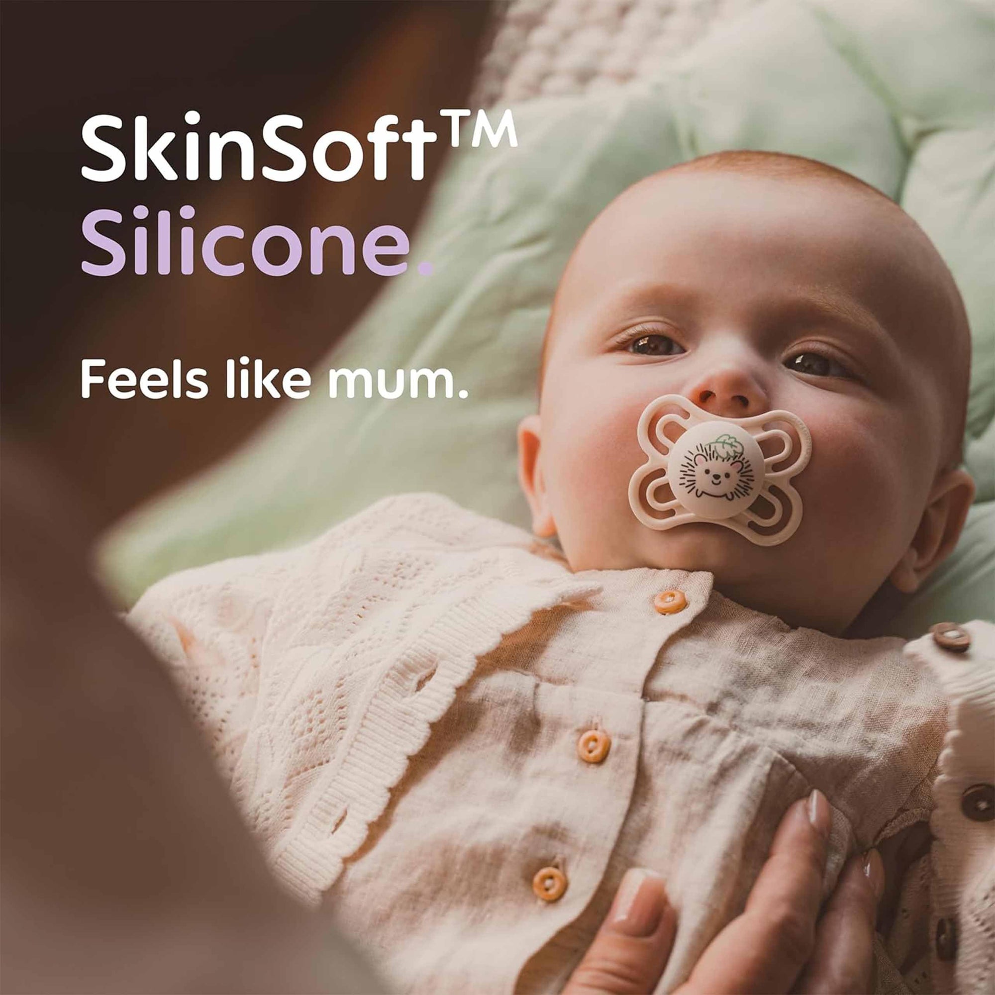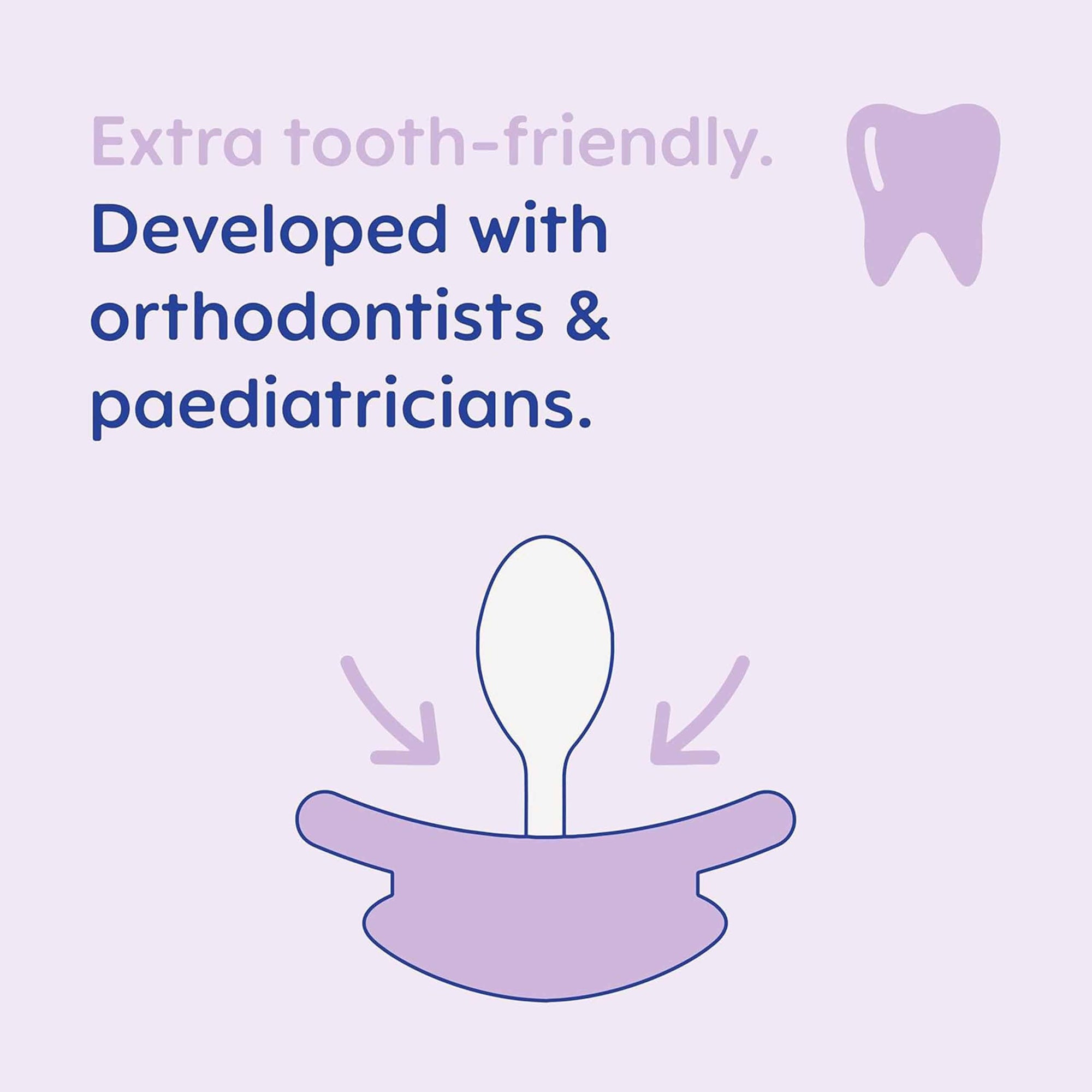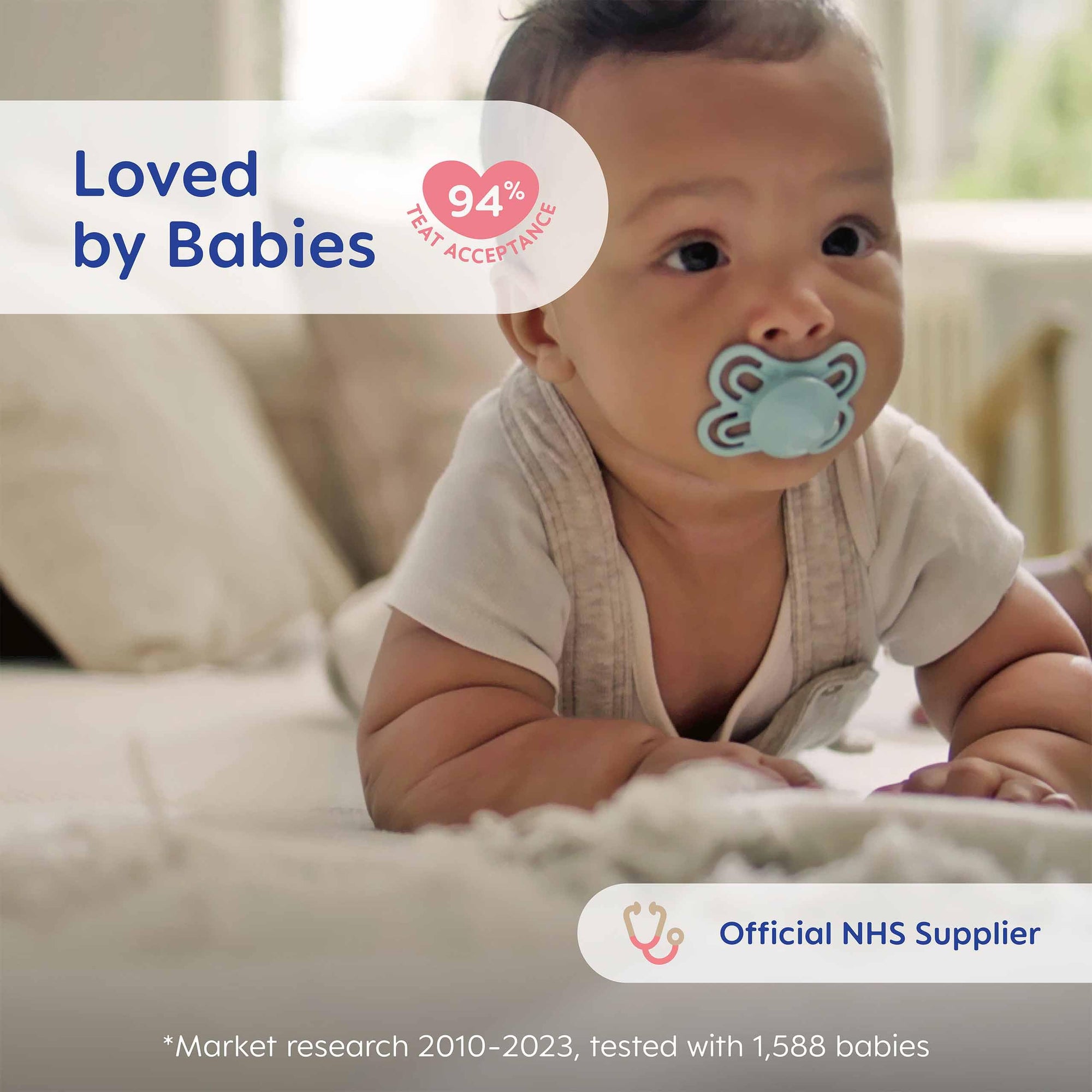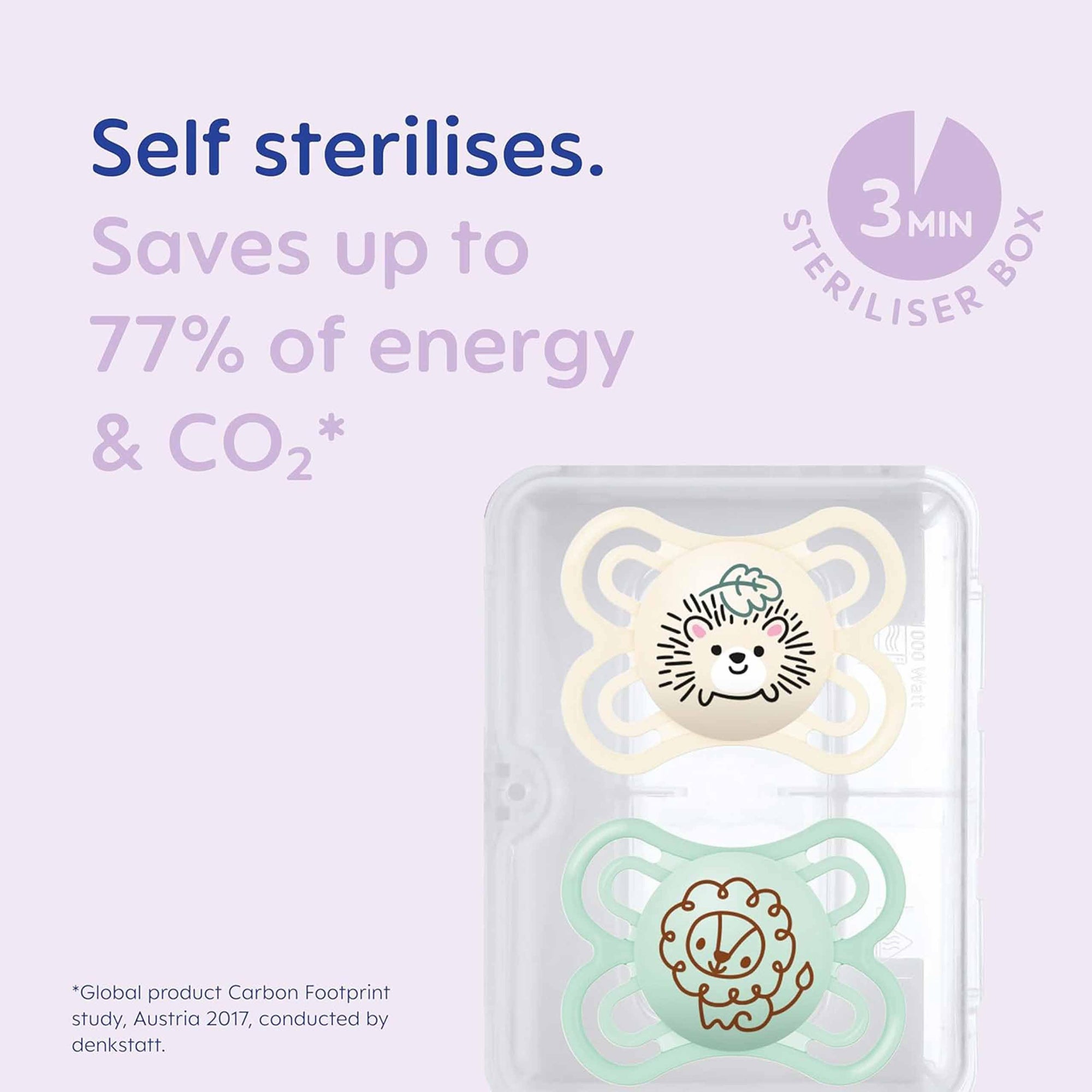 MAM Perfect Soothers are optimised to reduce the risk of misaligned teeth. They are 60% thinner and four times more flexible than competitor products. A series of independent tests have shown that the thinner and more flexible the neck of the teat, the less pressure is put on baby's teeth and jaw. MAM Perfect uses a unique teat with MAM's SkinSoft silicone surface. It is so soft and feels so familiar that it is accepted by 94% of babies*. Packed in a convenient steriliser box they can be sterilised in 3 minutes in the microwave without the need for a separate steriliser.