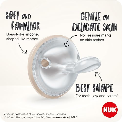 The breastfeeding relationship between mother and baby is precious and sensitive. This is why the NUK MommyFeel has a special design: so that it soothes without affecting the breastfeeding relationship. The teat is shaped like mommy‘s breast, and the silicone that it is made of is as soft as skin for a feeling just like at mommy. Another advantage of the soother is that only the baby’s lips touch the teat. The delicate sensitive skin around the mouth stays open to the air. This means the NUK MommyFeel does not cause any pressure marks and prevents skin irritation. From breastfeeding, babies will already know how to rest the lips gently on it: one of the main reasons why medical experts recommend this soother. And naturally, the NUK MommyFeel also has the original NUK shape, the best for the teeth, jaw and palate.