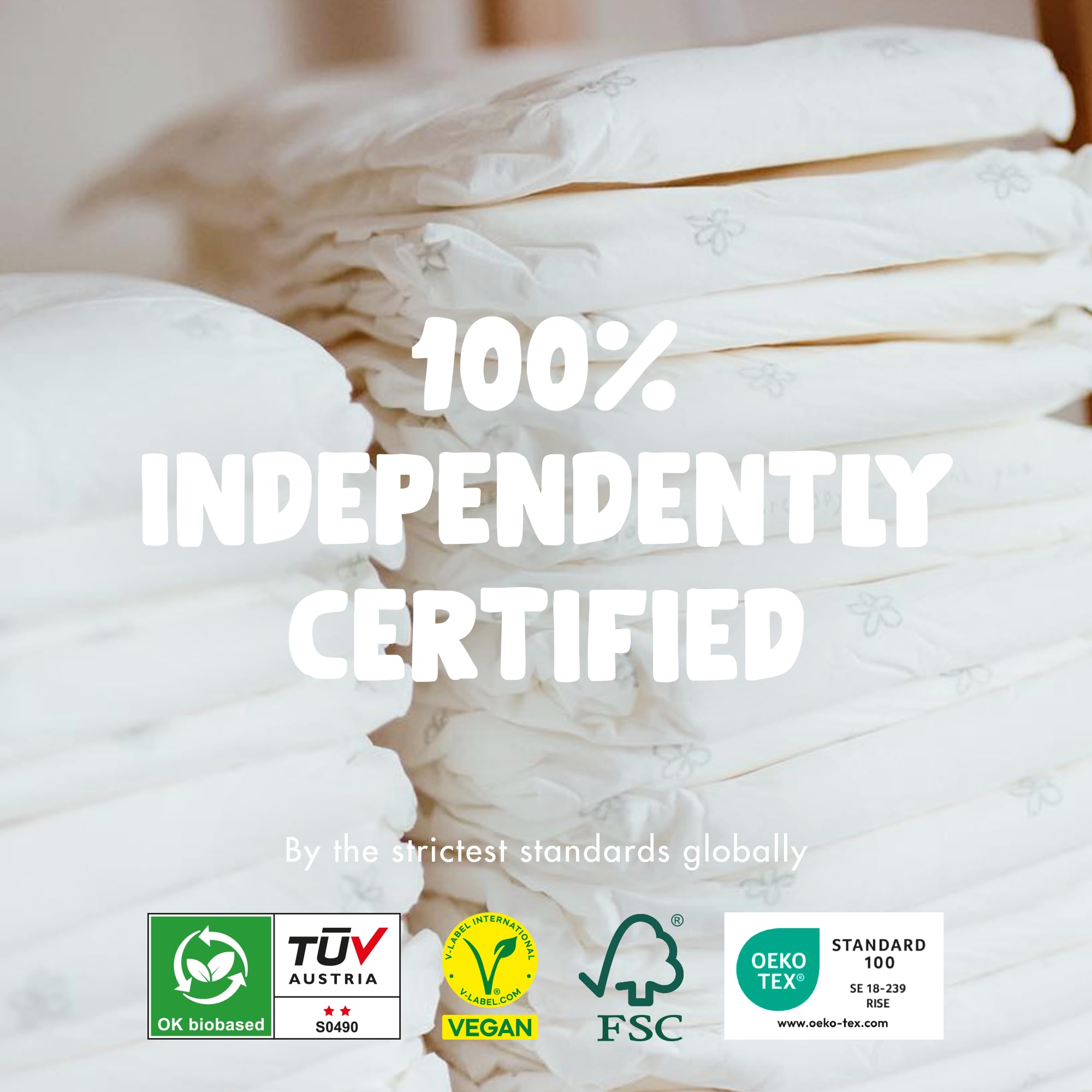 Their nappies are made featuring 0% oil-based plastic on the skin and plant-based fibers for breathability and comfort using highly absorbent wood pulp for dryness and protection against leaks.