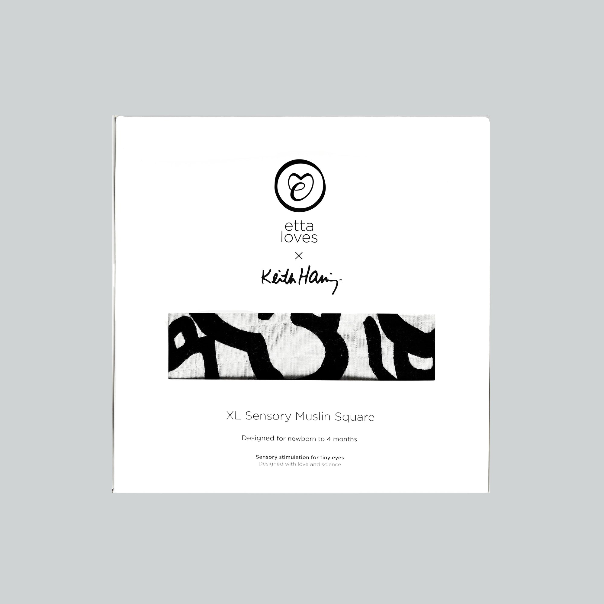 XL supersoft sensory muslin square in Keith Haring's iconic 'Baby' print. High contrast black and white, rescaled to the millimetre to support babies' cognitive and visual development between birth and around four months. Perfect for cuddles, spillages, for using as a lightweight blanket, breastfeeding cover or to put over a playmat to encourage tummy time. You can even wind it up in a car window for shade and stimulation for calmer car journeys.