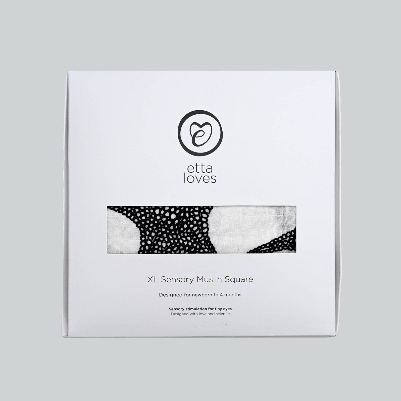 XL supersoft sensory muslin square in high contrast black and white starfish print. Designed to the millimetre to support babies' cognitive and visual development between birth and around four months. Perfect for cuddles, spillages, for using as a lightweight blanket, breastfeeding cover or to put over a playmat to encourage tummy time. You can even wind them up in a car window for shade and stimulation for calmer car journeys.