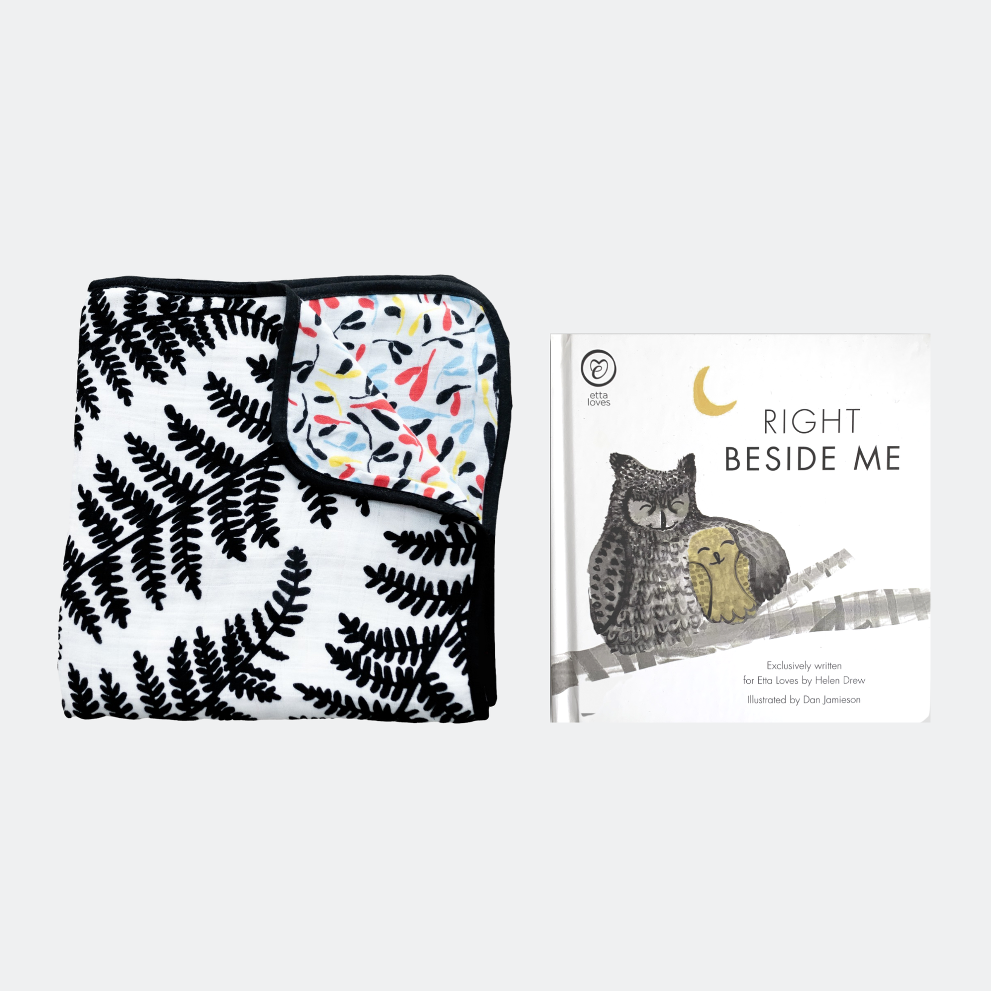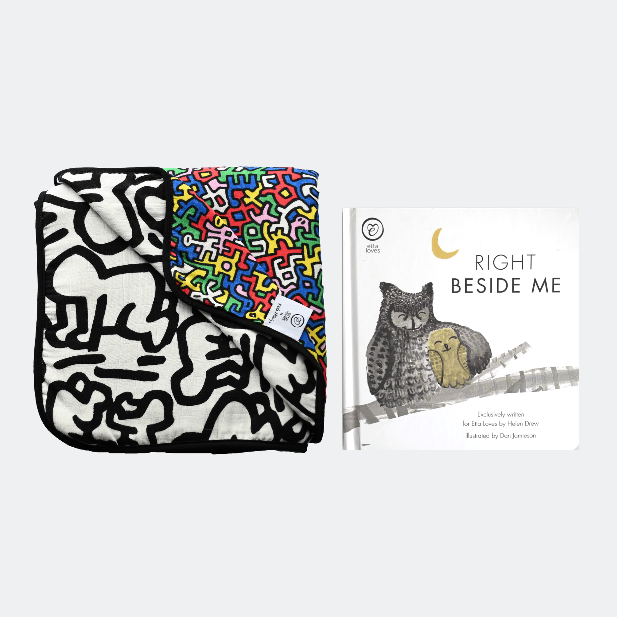 Cuddle up and enjoy this beautiful book under our sumptuously soft reversible sensory blanket.. This bundle is perfect for those all important connection times, as reading to your baby has been proven to be beneficial from birth.. Bundle contains one of our 120x120cm organic cotton reversible muslin blankets - in either Animal Print, Plant Print of our limited edition Keith Haring collection.