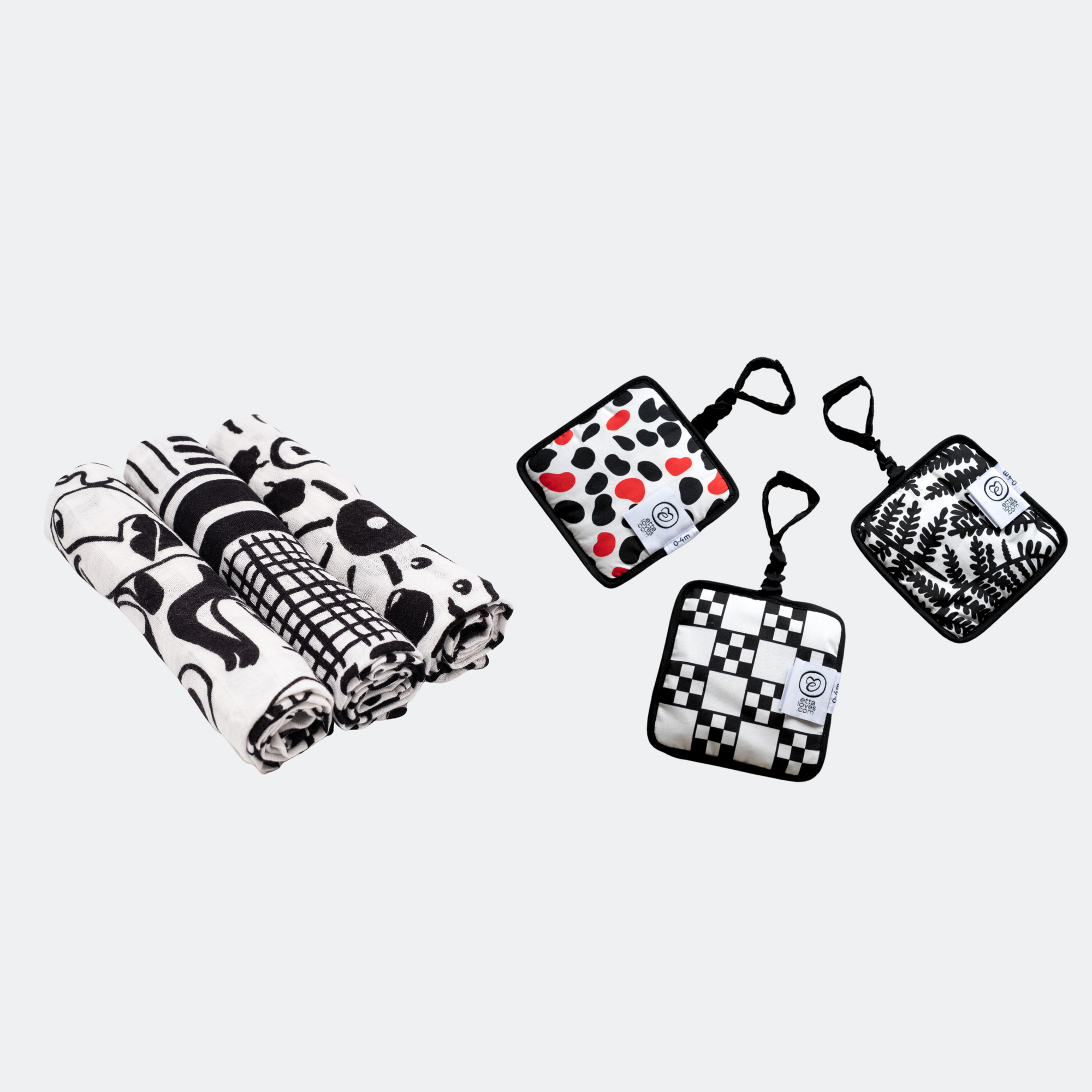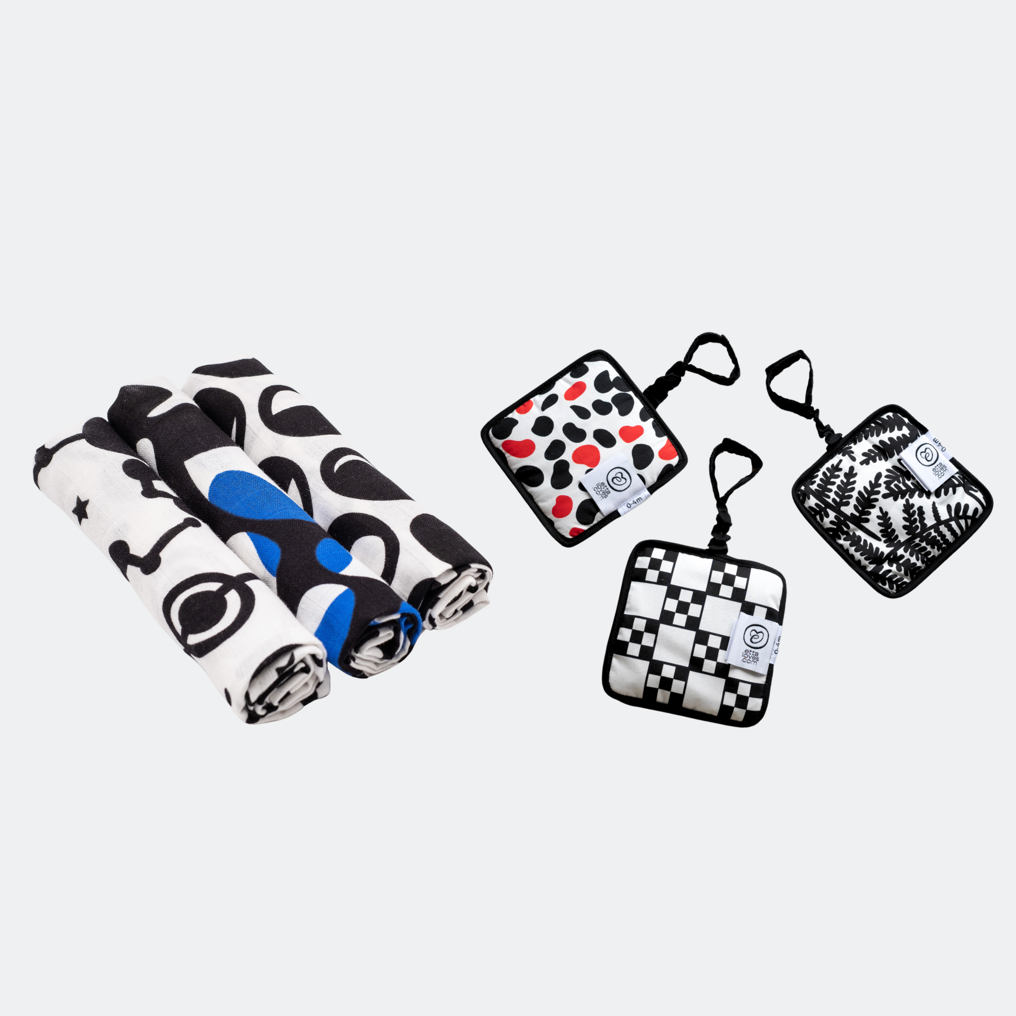 Our first ever product and our newest product come together to make this highly versatile bundle. Our new hanging squares clip onto almost anything - car seats, prams, baby gyms and more besides. Coupled with our best selling muslin 3-packs you won't need anything more for your baby's visual development, at home or on the go.