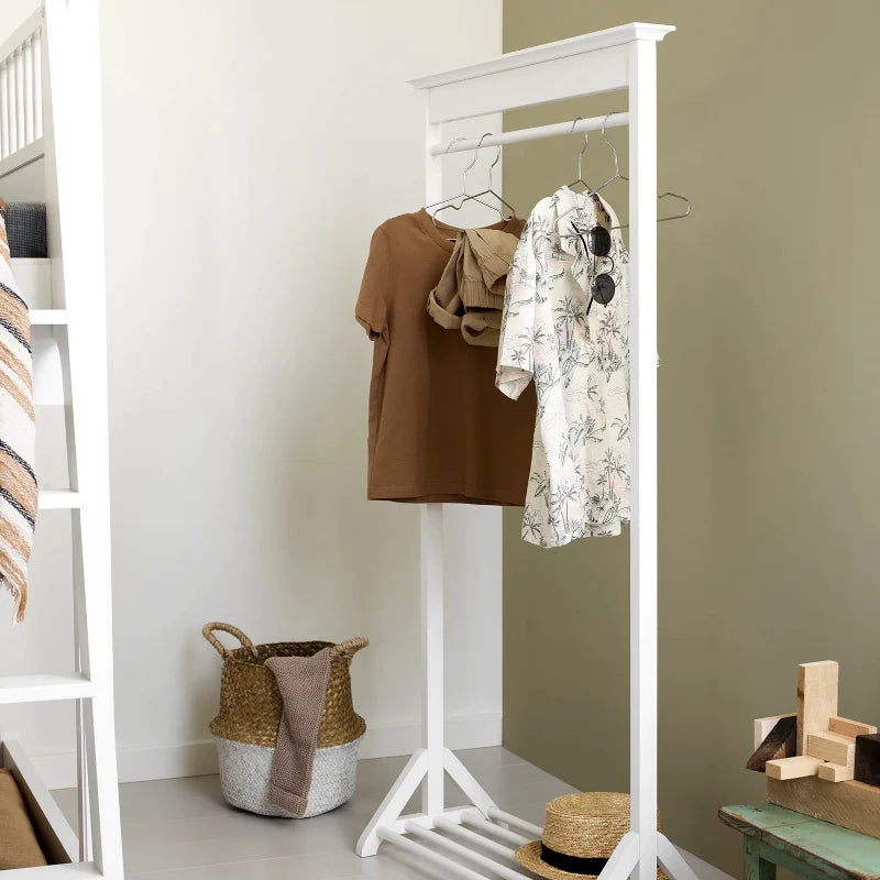 Lovely little clothes rail for the kids room. A practical extra storage for clothes – Especially the girls will love to use it for dress up clothes and for all their favourite dresses.