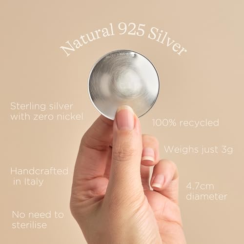 The ORIGINAL silver nipple cups, now available exclusively from Lansinoh. Loved by mums for almost 25 years, the Silverette Silver Nursing Cups naturally protect and help heal sore nipples throughout your breastfeeding or pumping journey. Handcrafted in Italy from natural 925 sterling silver, each protective nipple cup is specially moulded with a curved peak and folded edges, allowing air to circulate and provide a comfortable, cooling fit over your nipple. Incredibly lightweight, our silver nipple shields can be used in between feeds or pumping sessions to provide a physical barrier against clothing to reduce painful friction, while also soothing and helping to heal sore, damaged nipples. DESCRIPTION • The original silver nursing cup from Italy • Protects sore nipples helping them heal naturally • Antimicrobial properties of silver are widely recognised • Works with your breastmilk, no other creams needed • Handcrafted by registered silversmiths • Certified, natural 925 silver with NO nickel • 100% recycled cups and packaging • Anatomically shaped to comfort your areola without compressing it • Reusable for as long as needed, and again for each child you feed • Lightweight at just 3g each • 4.7cm diameter, 1.6cm depth • Awarded Gold in 2024 Loved by Parents Awards HOW TO USE & CLEAN After each breastfeeding session, leave a couple of breastmilk drops in each cup and apply them directly to the nipple. Before the next feed, simply remove the silver nipple cups and rinse your nipples with water before breastfeeding. Silverette can be washed with warm water and soap between each feed, with no need to sterilise. Silverette may tarnish over time due to the natural oxidisation process that occurs in silver, however it is still safe and effective to use. To remove the tarnish, make a paste using a mix of bicarbonate of soda (one teaspoon) with a few drops of water. Rub the paste over the cups, rinse and pat dry. Do not wash Silverette in the dishwasher. INGREDIENTS 100% recycled 925 silver. Contains no nickel.