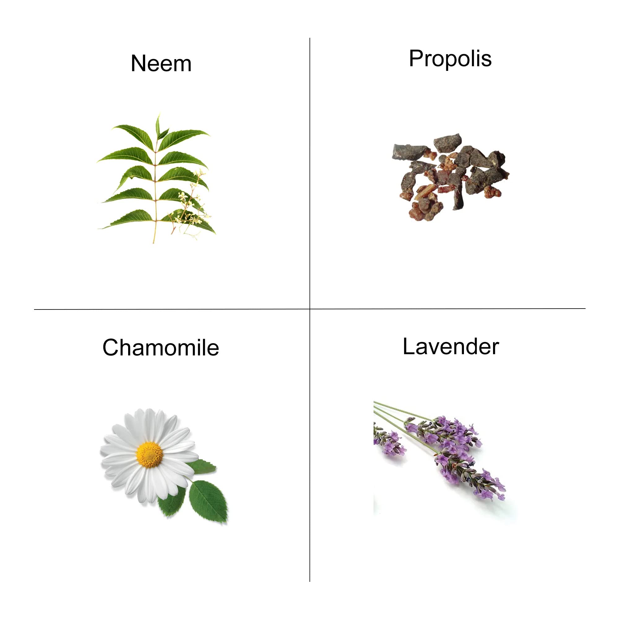 Contains marigold, neem, chamomile, Propolis and lavender for gentle and effective results. In addition, these ingredients provide a soothing and desirable property. It is 100% organic.