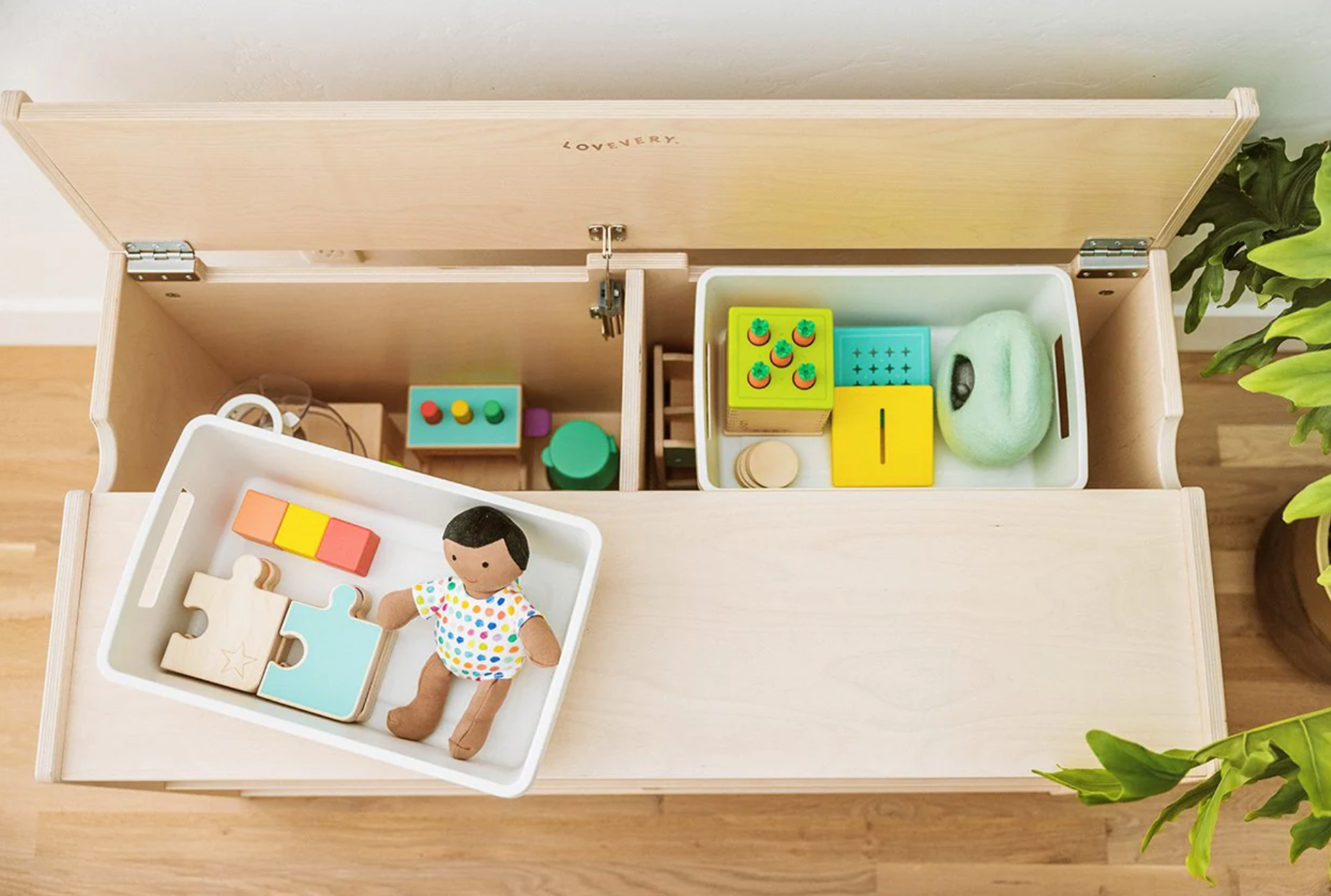 Bring the benefits of a Montessori play experience to your home with The Playshelf by Lovevery. The 2-in-1 storage shelf makes toy rotation and storage simple in a modern, 100% birchwood design.