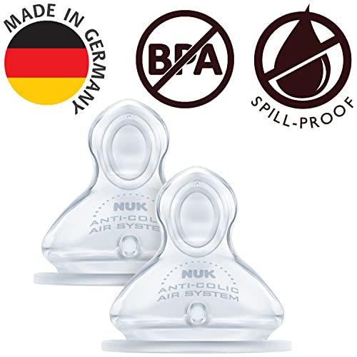 NUK First Choice+ Teats replicate the shape of a mother's nipple during breastfeeding. The extra soft tip easily takes on different shapes whilst also promoting the development of the mouth, lips and tongue. The orthodontic NUK shape, combined with the NUK First Choice+ extra wide lip support, makes it easier to alternate between breast and bottle feeding. The improved Anti Colic Air System minimises infant colic caused by the harmful swallowing of air. Silicone is a stronger and more durable material, which will last longer than latex.