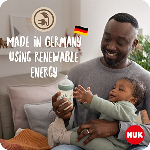 Natural soothes best. That's why the NUK for Nature baby bottle is not only naturally shaped, it is also made from natural raw materials and packaged in an environmentally friendly way, with production methods that respect nature. This NUK baby bottle is made from 100% natural raw materials, with certified sustainable silicone and plastic. From raw materials, to renewable, energy-efficient production, everything is optimised to be as climate-friendly as possible. Inspired by nature, several tiny openings on the extra-soft teat are modeled on a mother's nipple to give a smooth, natural flow, and the bottle is recommended by midwives and pediatricians. The built-in Temperature Control indicator changes colour from blue to white when the bottle's contents are too hot, so you can be sure your baby's milk is always at a comfortable drinking temperature.