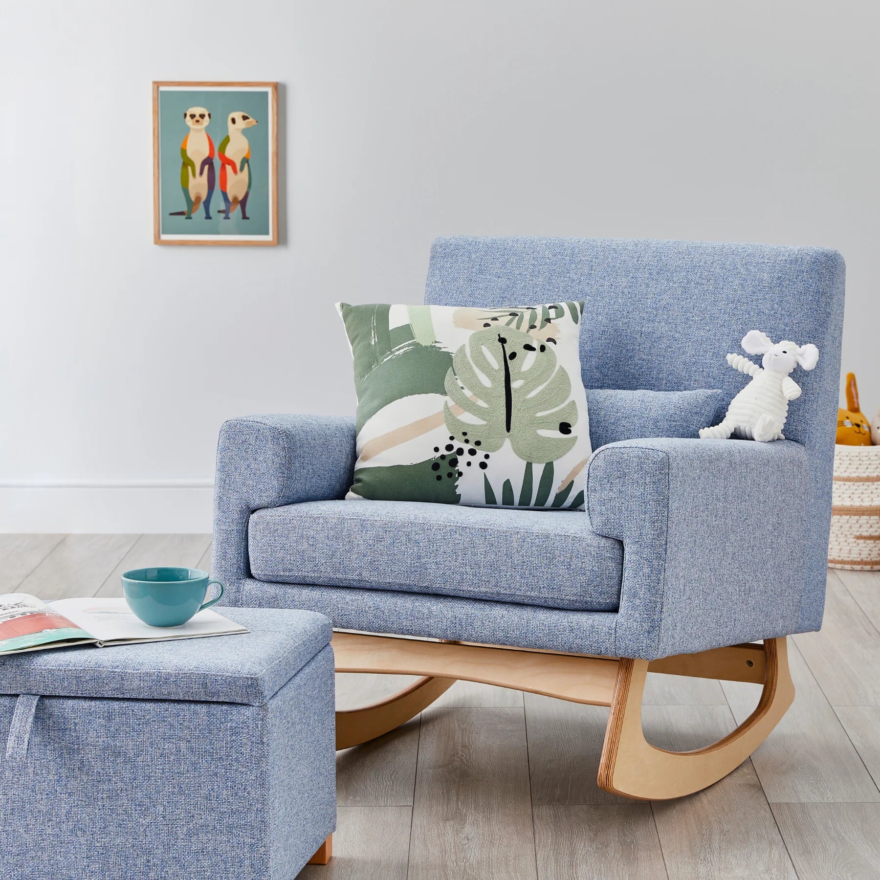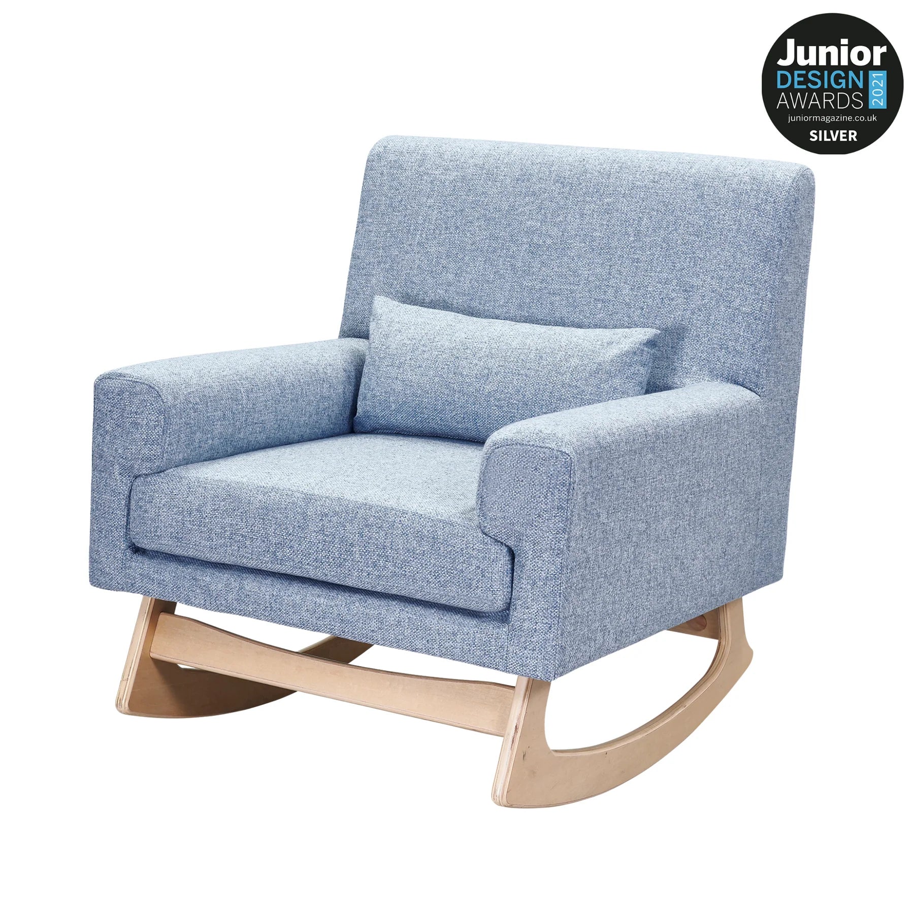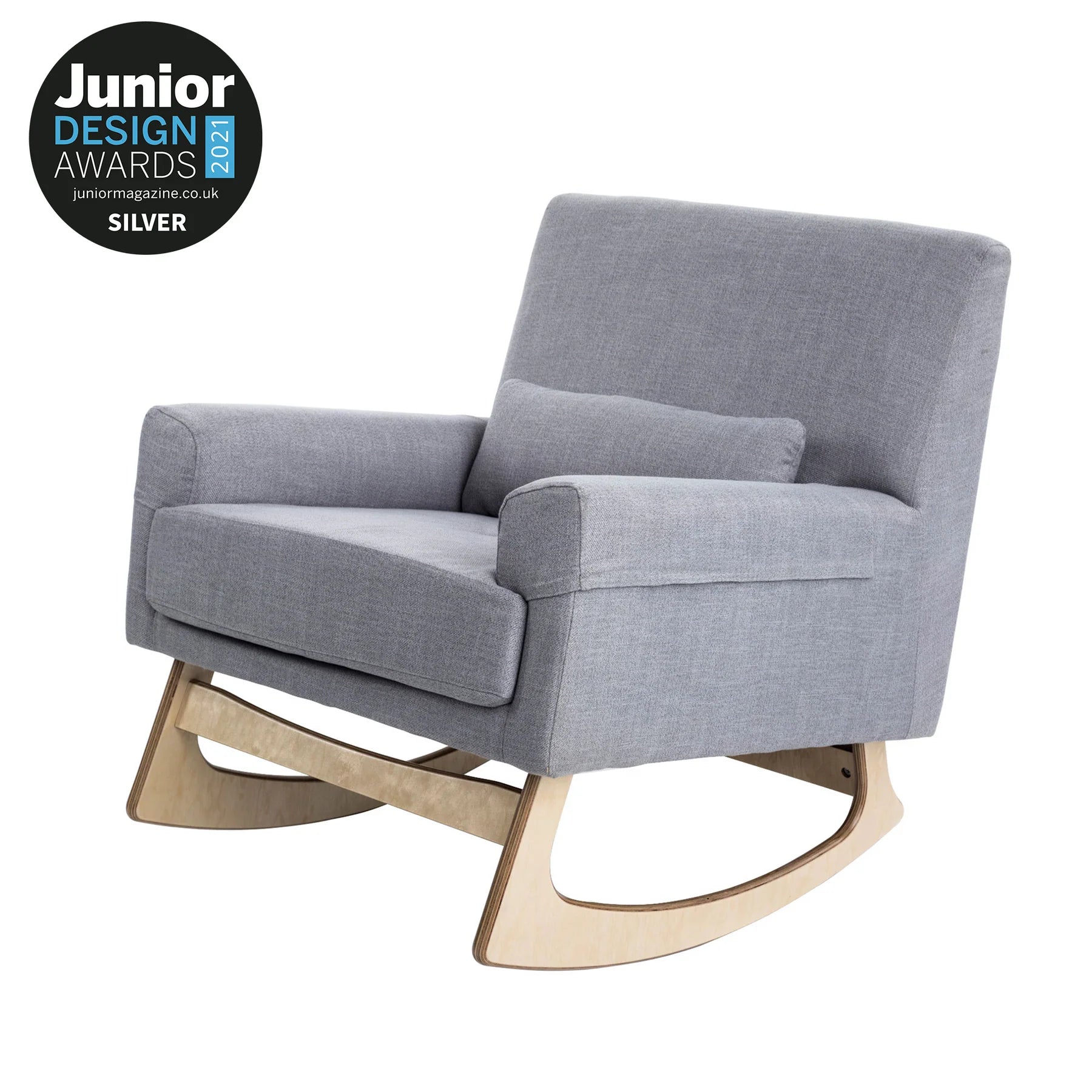 Our Tweed Collection nursing chairs feature a two-tone weave giving the piece texture & depth, natural birch wood legs offering a smooth rocking motion and allow easy transition from seated to standing with babe in arms.