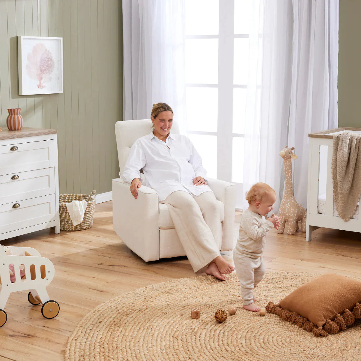 Meet Paige in our fresh, Sea Shell fabric. A glider recliner nursing chair designed to complement a home of clean lines and a minimalist style for ease, comfort and support while nursing your baby. The Paige nursery recliner chair provides so much gliding comfort and will last a lifetime in your home, without looking out of place thanks to with its timeless design that which will complement any nursery design.