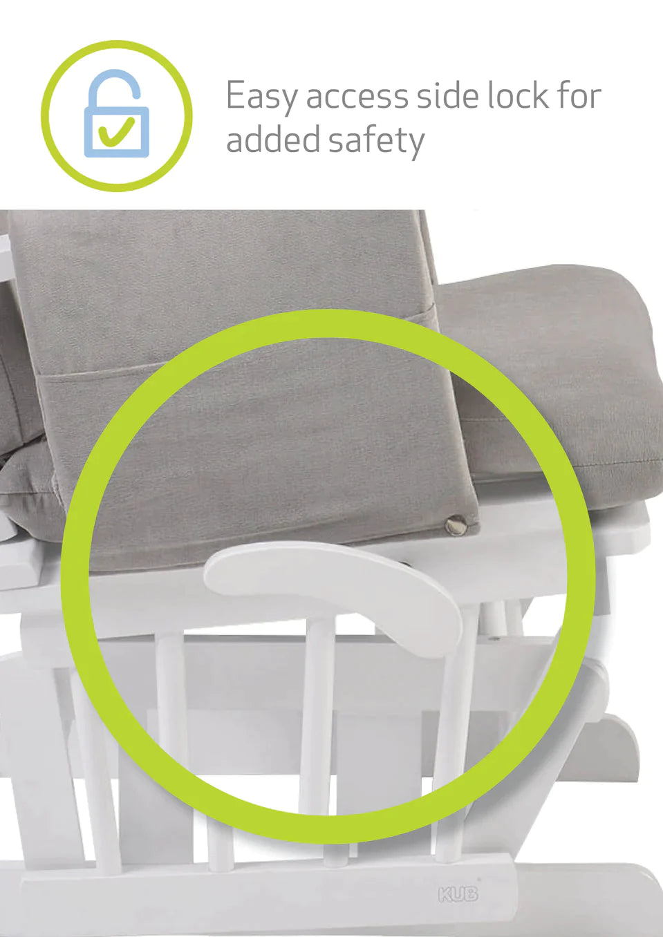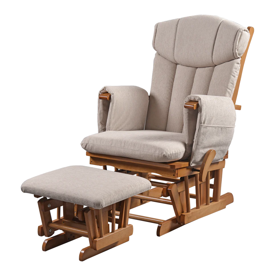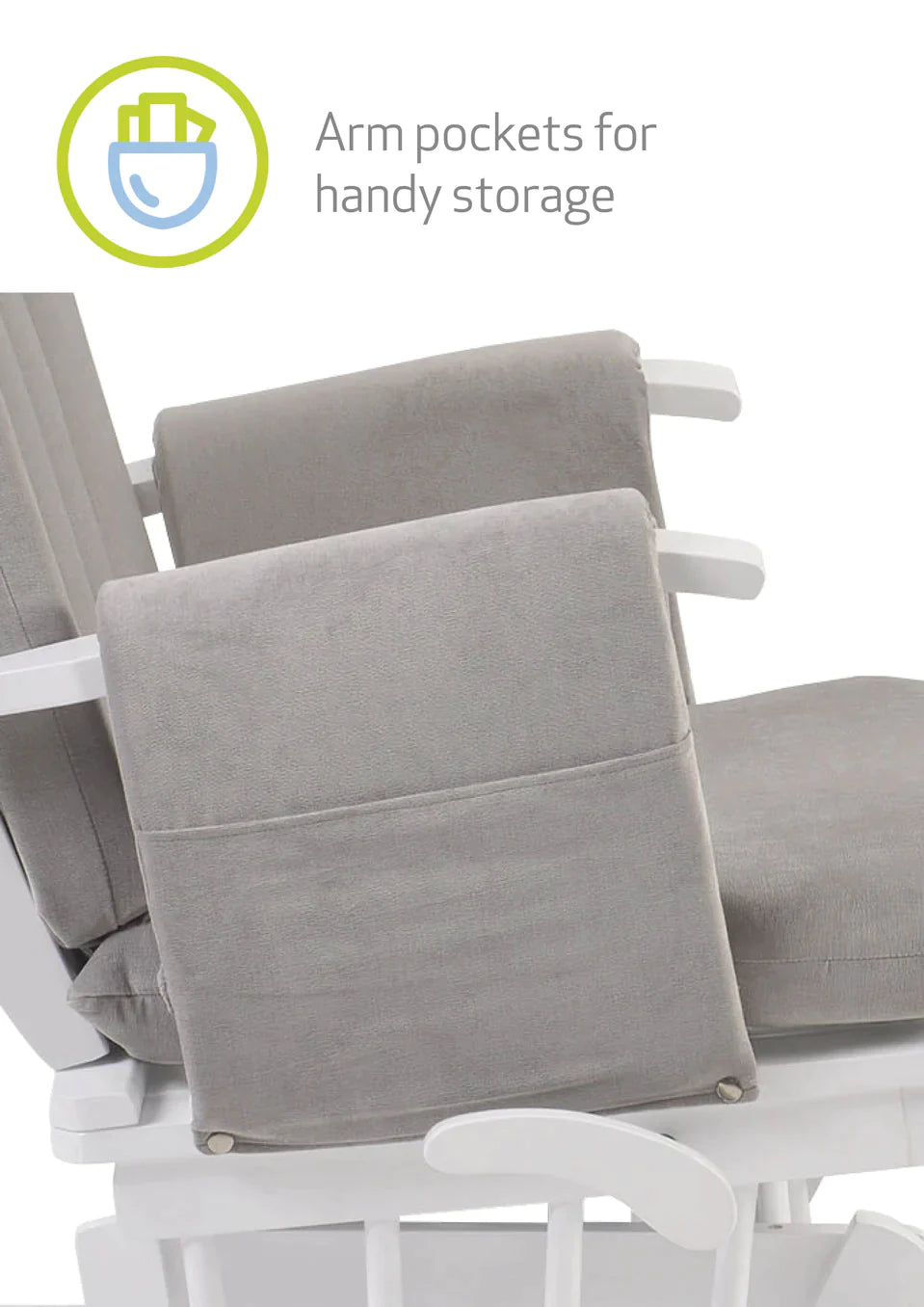 The Chatsworth glider nursing chair provides the maximum comfort and support with soft corduroy cushions. It is designed with a perfect cleaning solution for the parents. The arm and seat cushion covers can be removed and hand-washed. The cushion pockets provide handy extra storage space. The unique 7 recline position design enables you to adjust to the positions best for feeding. The gentle rocking mechanism helps getting your baby to sleep. The glider chair also comes with a locking mechanism for added safety. The comfortable glider is designed with an elegant sleigh back rest to suit your nursery room style.