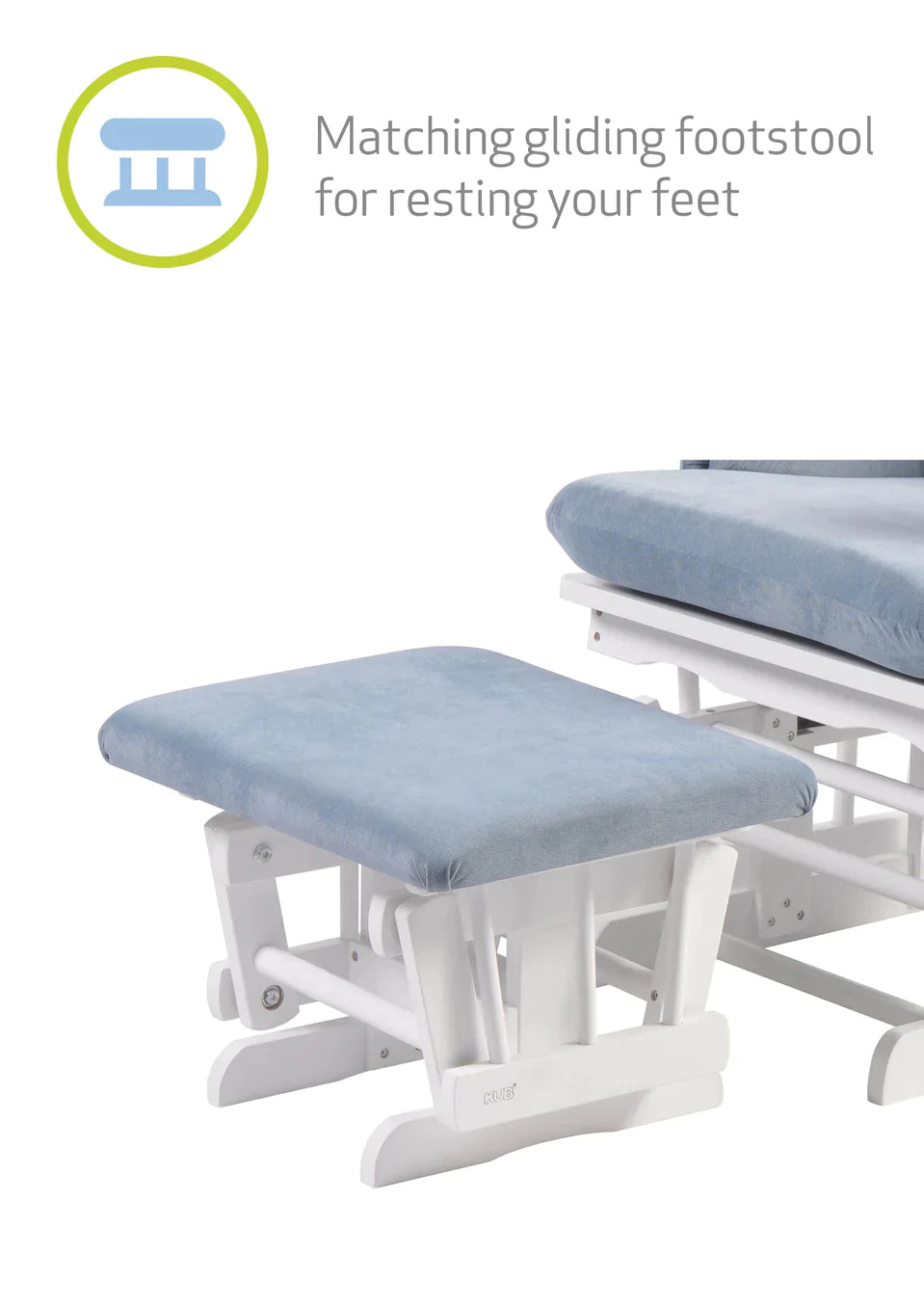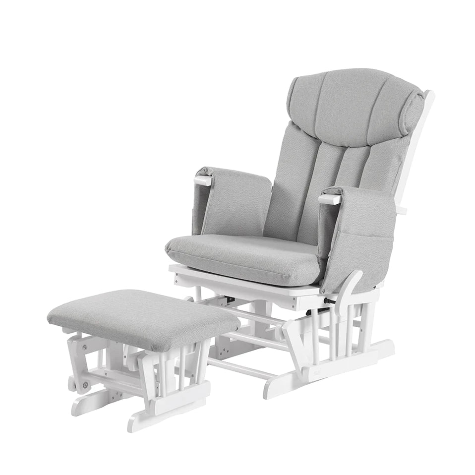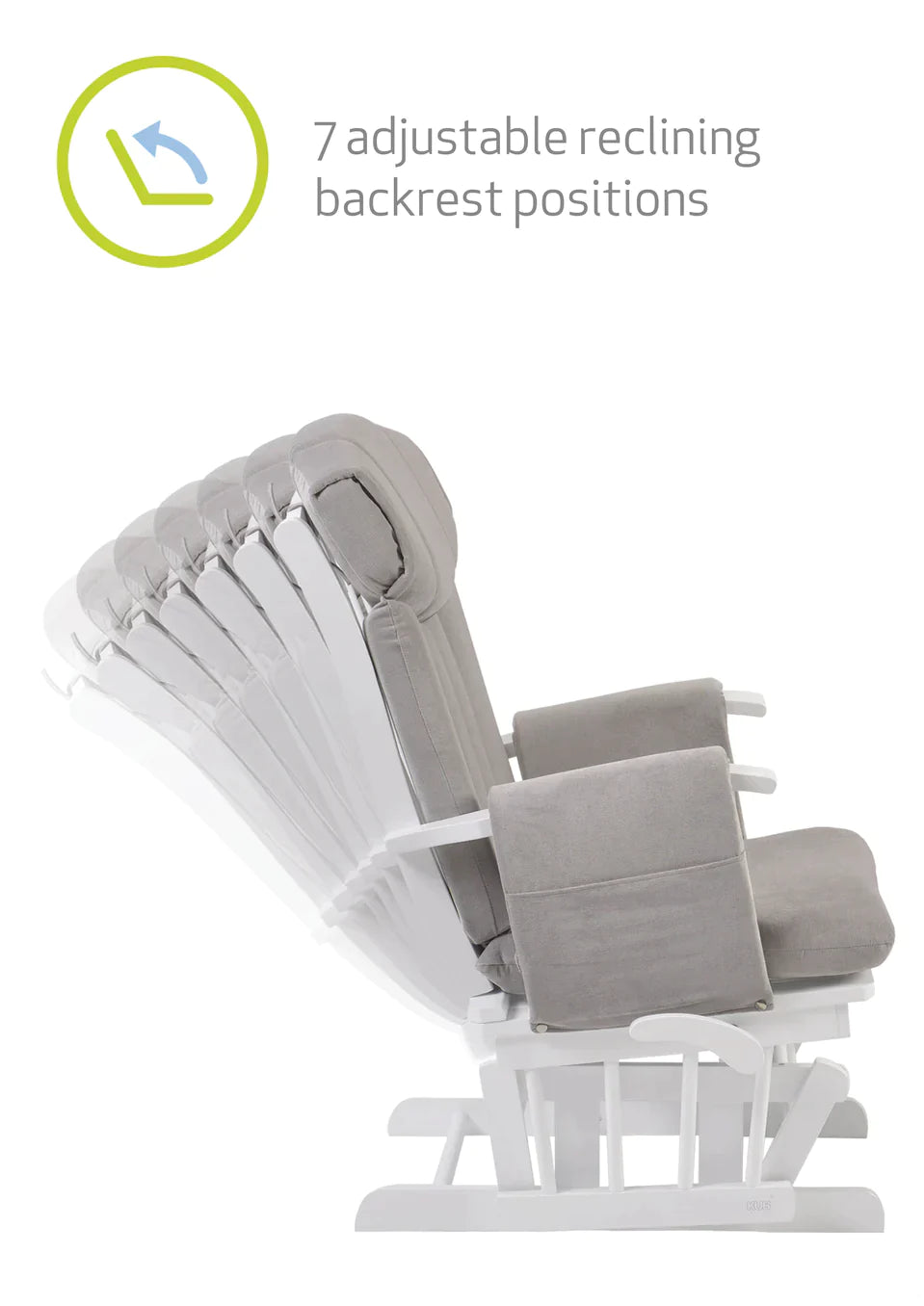 The Chatsworth glider nursing chair provides the maximum comfort and support with soft corduroy cushions. It is designed with a perfect cleaning solution for the parents. The arm and seat cushion covers can be removed and hand-washed. The cushion pockets provide handy extra storage space. The unique 7 recline position design enables you to adjust to the positions best for feeding. The gentle rocking mechanism helps getting your baby to sleep. The glider chair also comes with a locking mechanism for added safety. The comfortable glider is designed with an elegant sleigh back rest to suit your nursery room style.