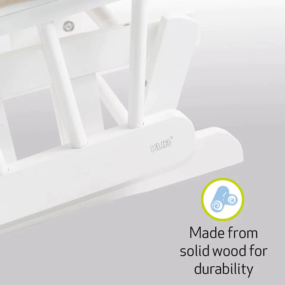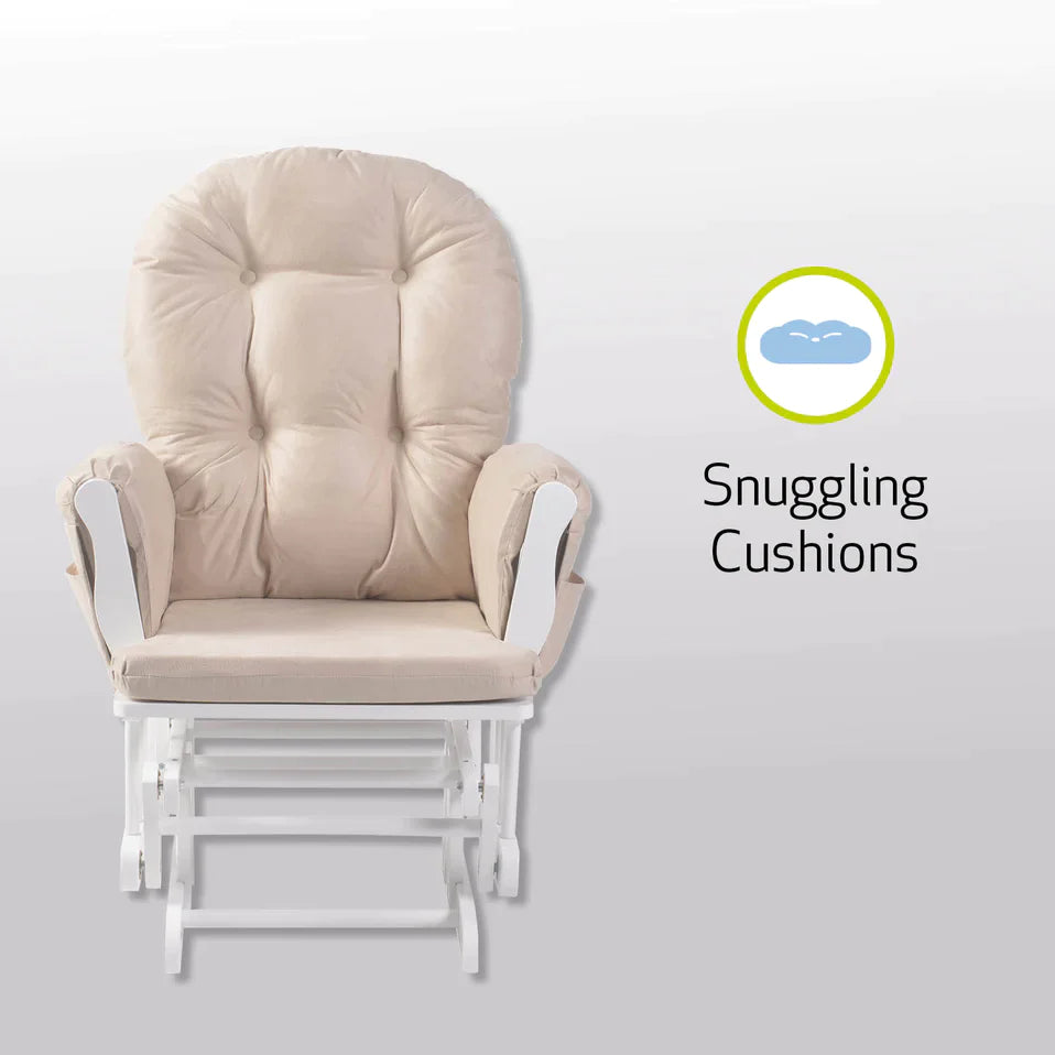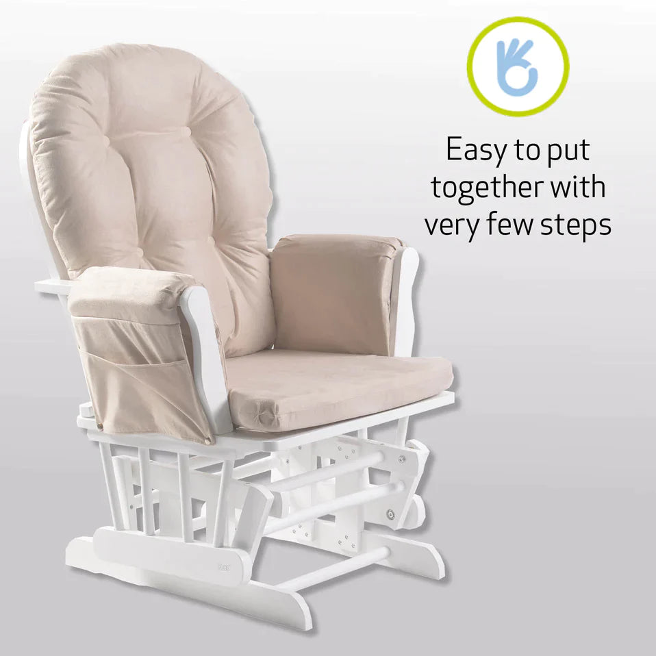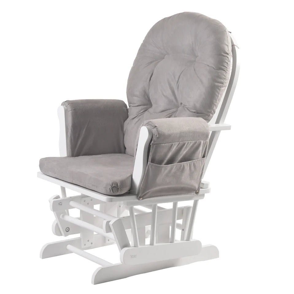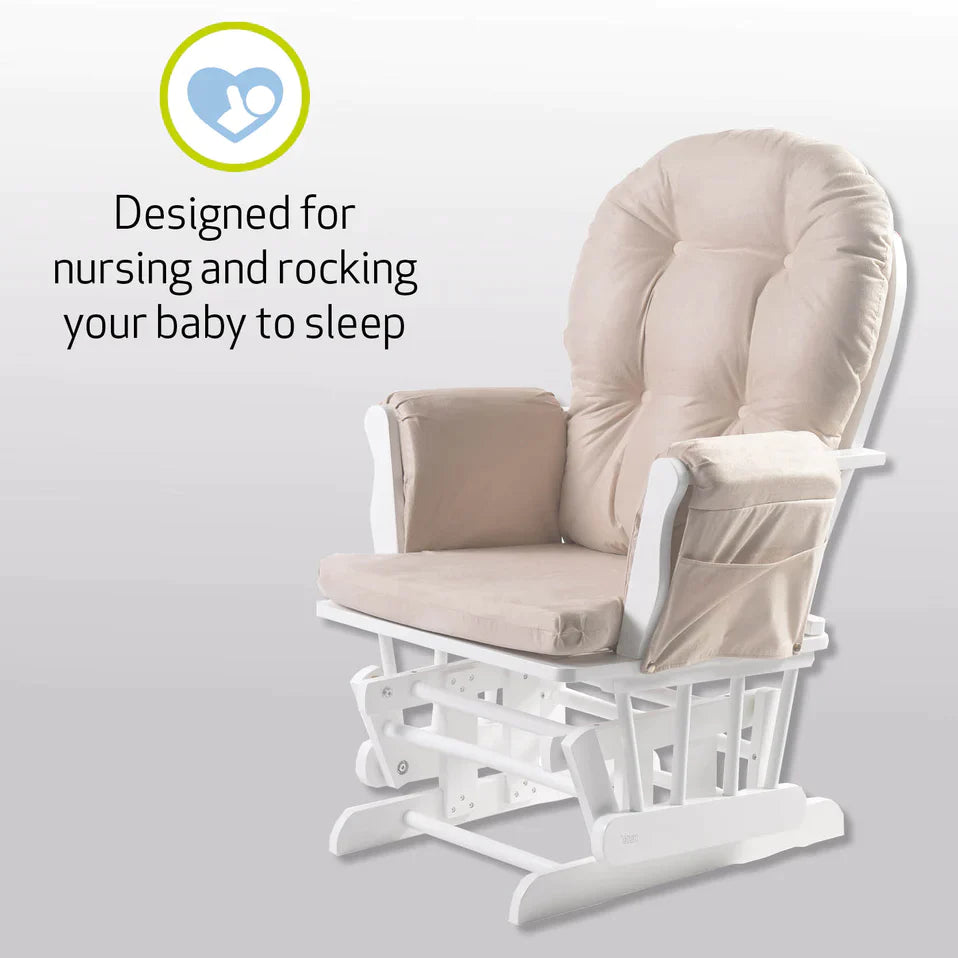 The Haywood glider nursing chair in white is spacious and comfortable; the perfect way for feeding your baby or just relaxing in the nursery with a smooth and gentle rocking motion. Made from solid wood and upholstered with a soft cream-coloured and grey fabric. The ergonomic cushions and the bow back design will help promote correct posture while nursing and the convenient pockets on the sides will help keep all the nursery items handy. The chair only version gives you the option to save some space in your nursery as well as saving your pocket.