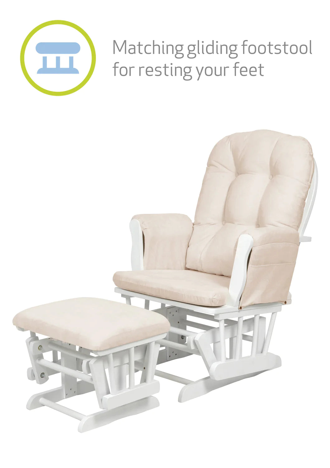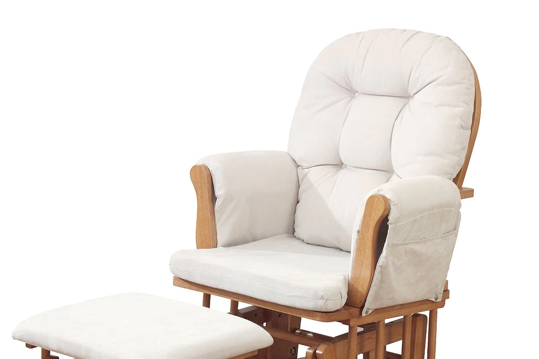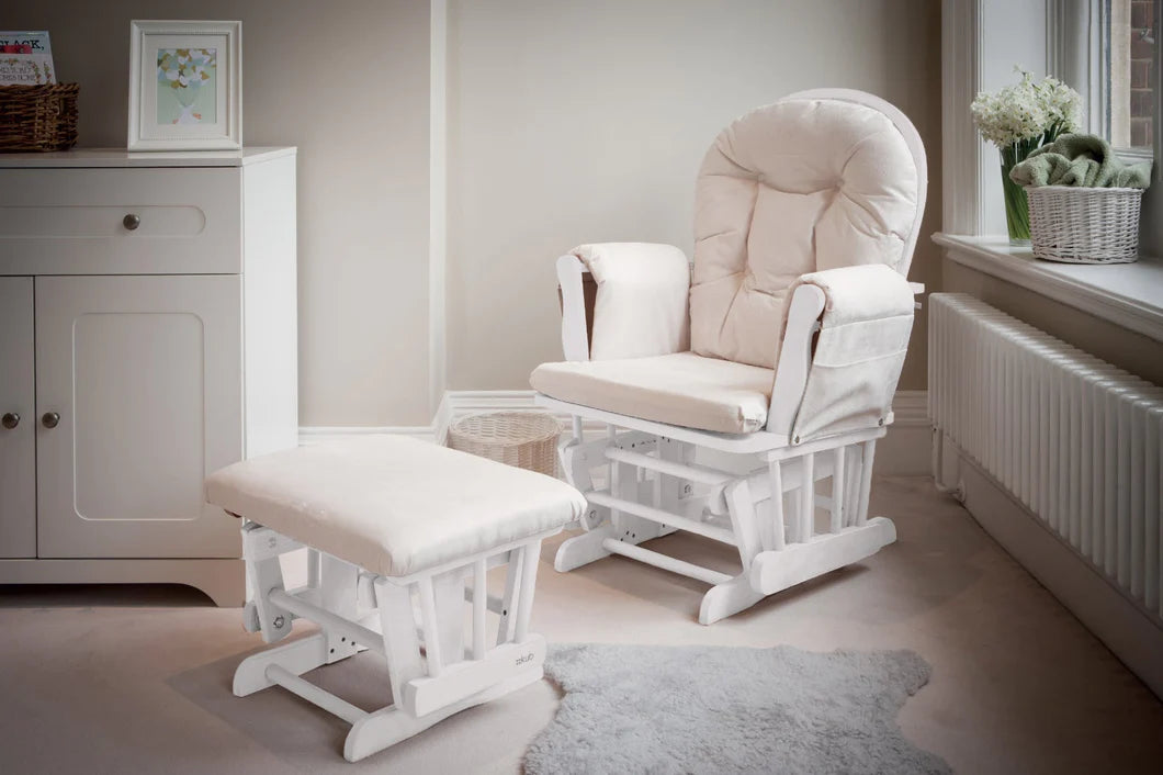 The Haywood glider nursing chair in white by Kub Nursery is spacious and comfortable; the perfect way for feeding your baby or just relaxing in the nursery with a smooth and gentle rocking motion. Made from solid wood and upholstered with a soft cream-coloured fabric, the Haywood glider comes complete with a matching rocking footstool. The ergonomic cushions and the bow back design will help promote correct posture while nursing and the convenient pockets on the sides will help keep all the nursery items handy.