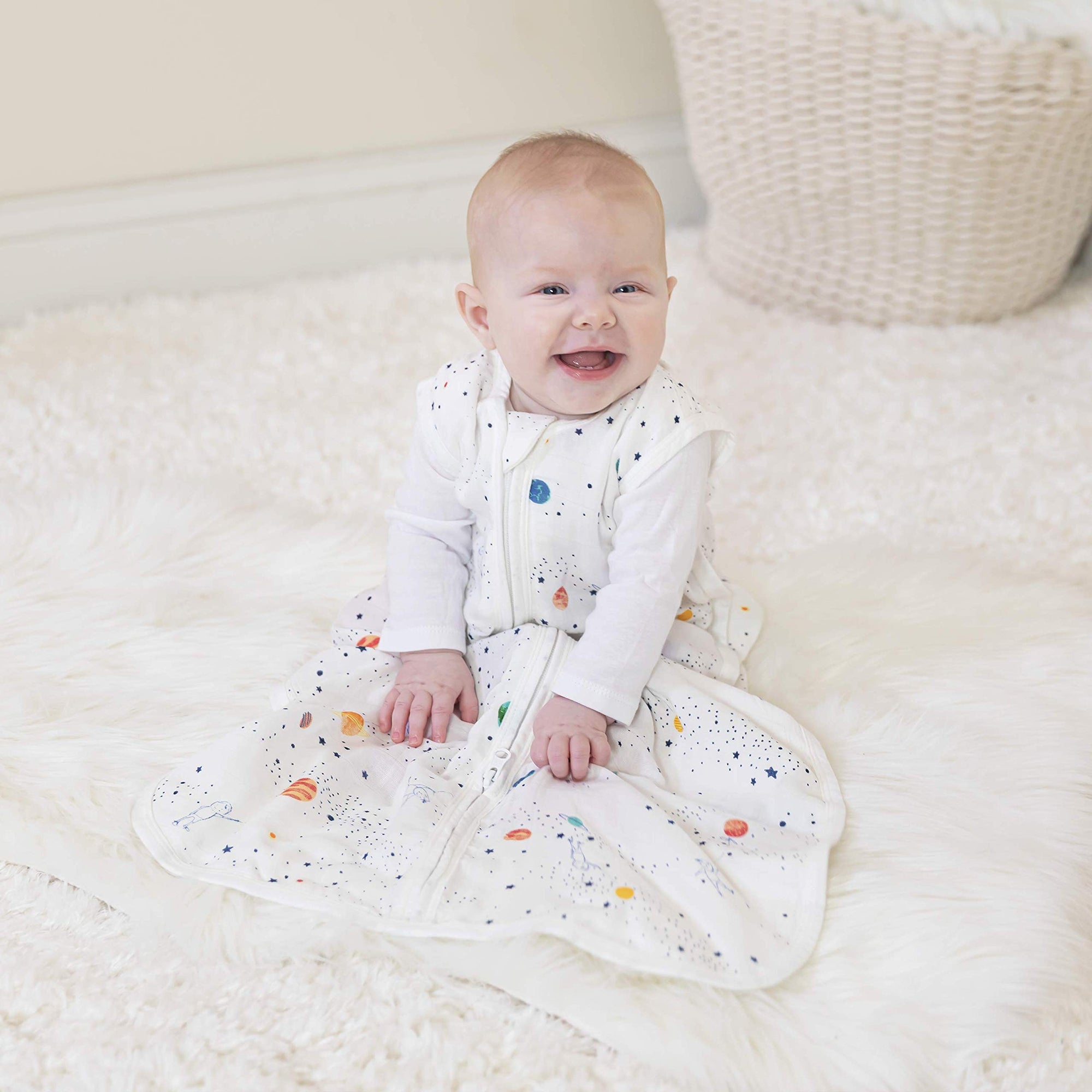 The aden + anais silky soft sleeping bag keeps baby feeling comfy and secure when transitioning out of a swaddle and beyond. Designed to be worn over pyjamas, this super soft 100% viscose made from bamboo baby sleeping bag eliminates the need for loose blankets in the cot for a safer sleep. Made from a single layer of breathable muslin, the wearable blanket allows for airflow, helping to reduce the risk of overheating for a peaceful night’s sleep for baby and you. Its convenient zip opens from the bottom, making nighttime changes easy.