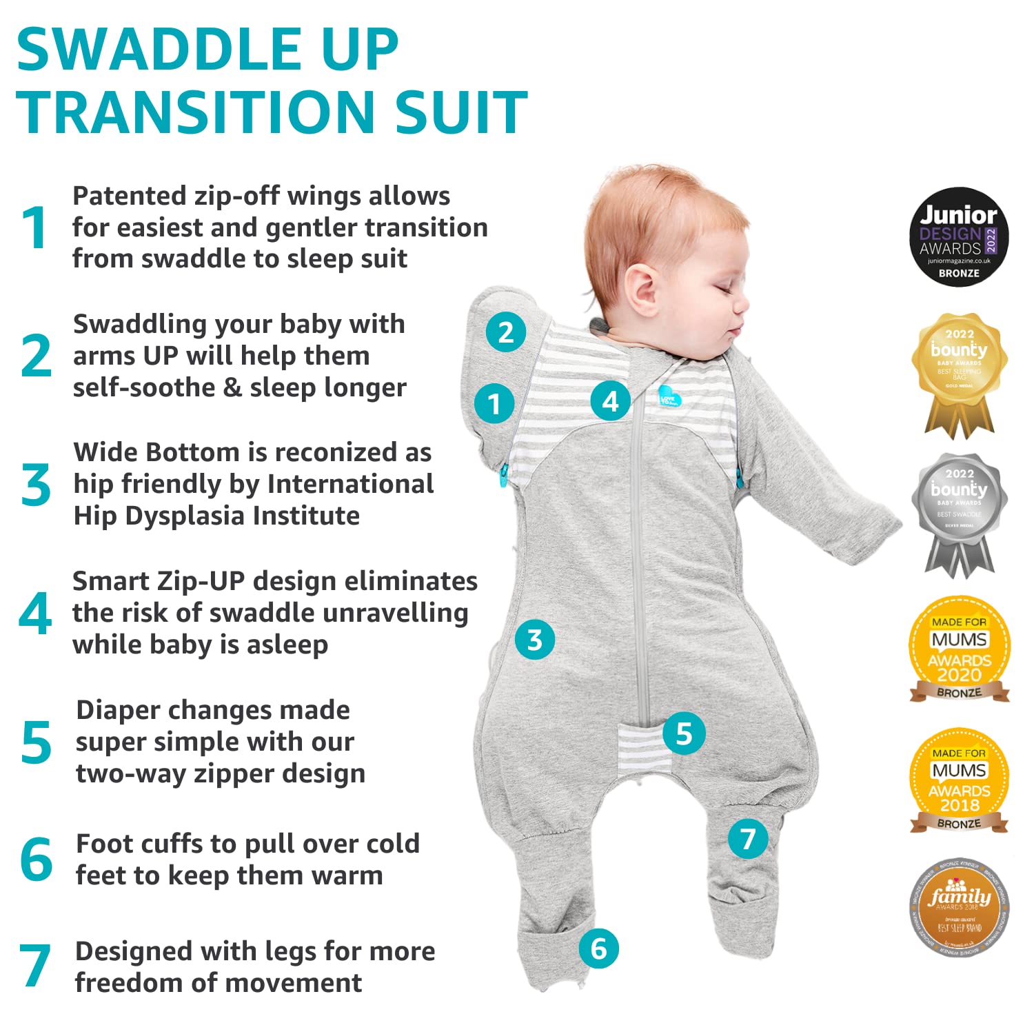 Did you know that ARMS UP™ swaddling must come to an end as babies start to independently roll onto their sides? The Love to Dream Swaddle Up™ Transition Suit Cotton Original is the perfect tool for a no-fuss transition out of swaddling, helping reduce sleepless nights for you and your little one.