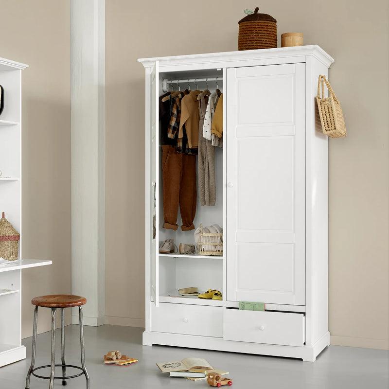The functional, flexible concept combined with the classic, sophisticated expression make the wardrobe an eye-catcher The sides of the wardrobe are designed with integrated, hooks for hanging everything. While the spacious interior of the wardrobe can be configured to fit with flexible shelving, the continuous hanging rod and bottom drawers are fixed elements.